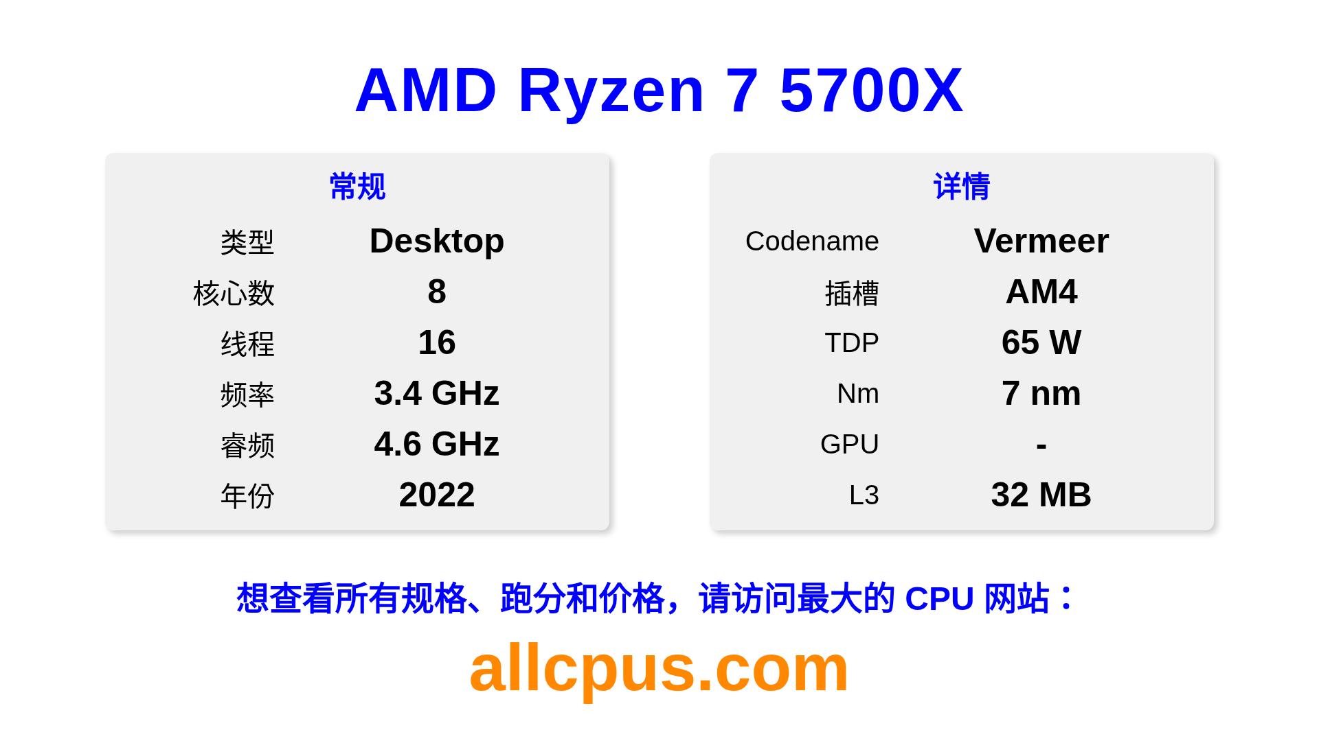 AMD Ryzen 7 5700X 是 AMD Ryzen 系列的 桌面处理器,基于 Vermeer 架构,于 2022 发布。 这款 CPU 拥有 8 核心,基础频率为 3400 MHz,最高加速频率为 4600 MHz,L3 缓存为 32 MB。 使用 7 nm 工艺制造。AMD Ryzen 7 5700X 设计用于 AM4 插槽。支持超频。 需要独立显卡。