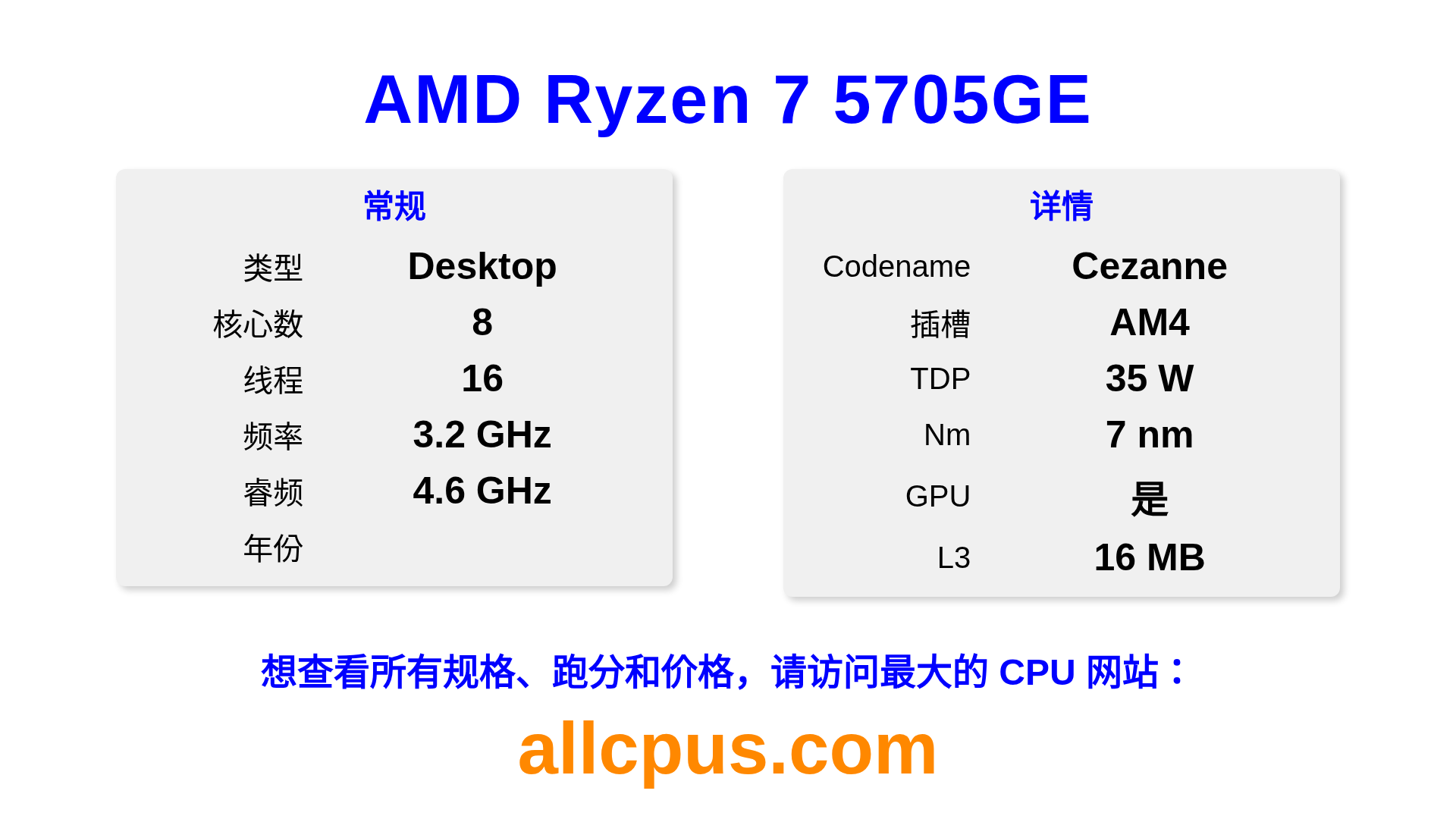AMD Ryzen 7 5705GE 是 AMD Ryzen 系列的 桌面处理器,基于 Cezanne 架构,于 发布。 这款 CPU 拥有 8 核心,基础频率为 3200 MHz,最高加速频率为 4600 MHz,L3 缓存为 16 MB。 使用 7 nm 工艺制造。AMD Ryzen 7 5705GE 设计用于 AM4 插槽。支持超频。 包括集成的 Radeon Graphics 显卡。