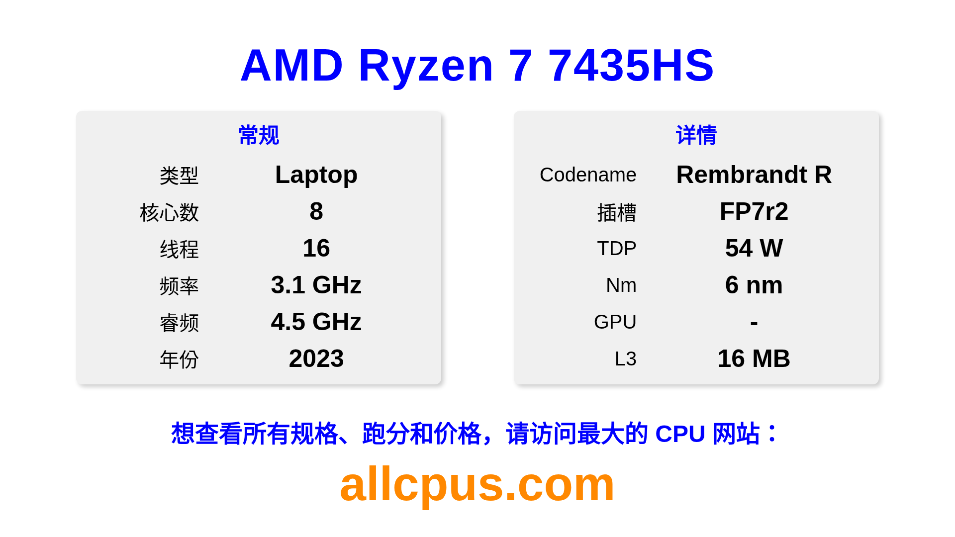 AMD Ryzen 7 7435HS 是 AMD Ryzen 系列的 笔记本处理器,基于 Rembrandt R 架构,于 2023 发布。 这款 CPU 拥有 8 核心,基础频率为 3100 MHz,最高加速频率为 4500 MHz,L3 缓存为 16 MB。 使用 6 nm 工艺制造。AMD Ryzen 7 7435HS 设计用于 FP7r2 插槽。 需要独立显卡。