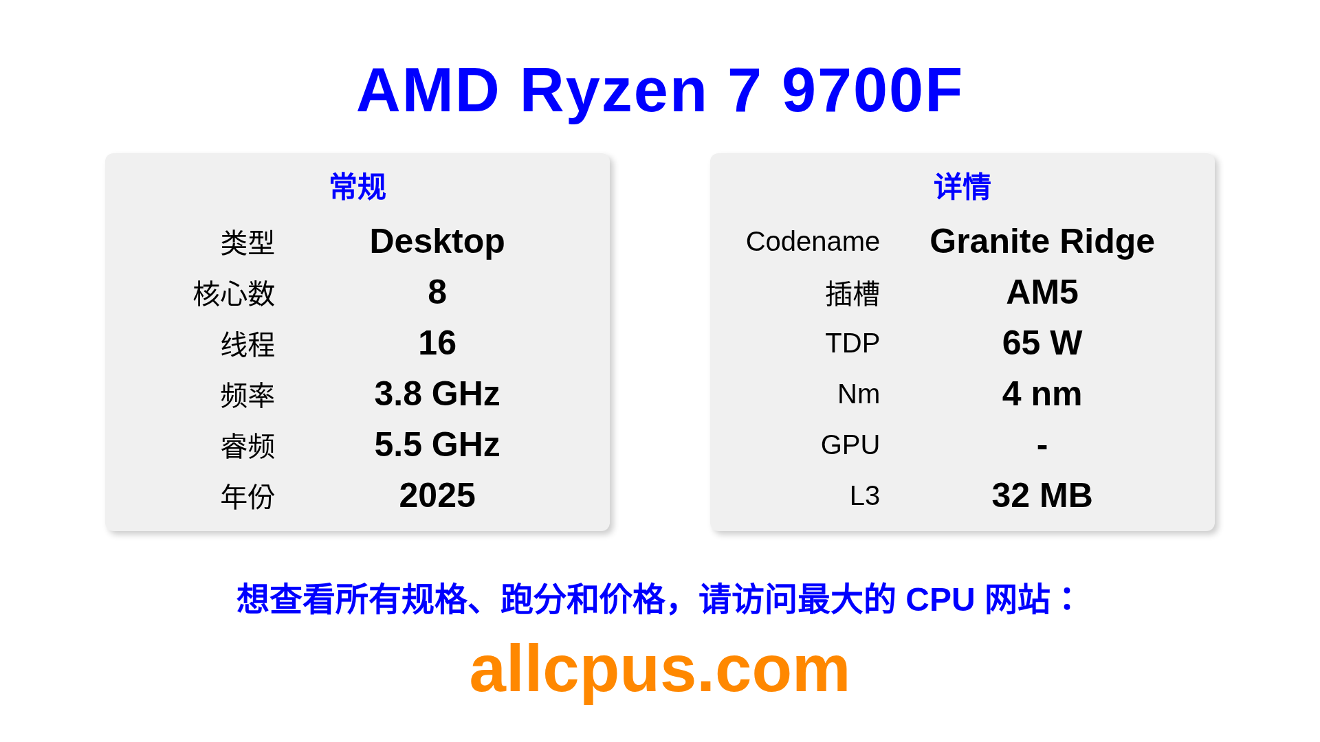 AMD Ryzen 7 9700F 是 AMD Ryzen 系列的 桌面处理器,基于 Granite Ridge 架构,于 2025 发布。 这款 CPU 拥有 8 核心,基础频率为 3800 MHz,最高加速频率为 5500 MHz,L3 缓存为 32 MB。 使用 4 nm 工艺制造。AMD Ryzen 7 9700F 设计用于 AM5 插槽。支持超频。 需要独立显卡。