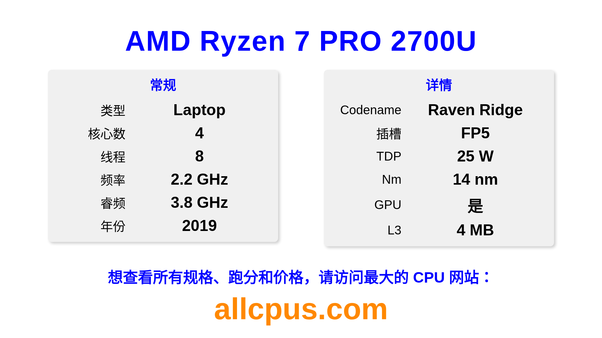AMD Ryzen 7 PRO 2700U 是 AMD Ryzen PRO 系列的 笔记本处理器,基于 Raven Ridge 架构,于 2019 发布。 这款 CPU 拥有 4 核心,基础频率为 2200 MHz,最高加速频率为 3800 MHz,L3 缓存为 4 MB。 使用 14 nm 工艺制造。AMD Ryzen 7 PRO 2700U 设计用于 FP5 插槽。 包括集成的 Radeon Vega 10 Graphics 显卡。
