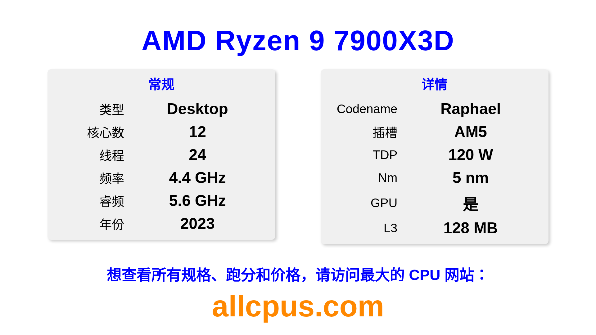 AMD Ryzen 9 7900X3D 是 AMD Ryzen 系列的 桌面处理器,基于 Raphael 架构,于 2023 发布。 这款 CPU 拥有 12 核心,基础频率为 4400 MHz,最高加速频率为 5600 MHz,L3 缓存为 128 MB。 使用 5 nm 工艺制造。AMD Ryzen 9 7900X3D 设计用于 AM5 插槽。支持超频。 包括集成的 AMD Radeon Graphics 显卡。