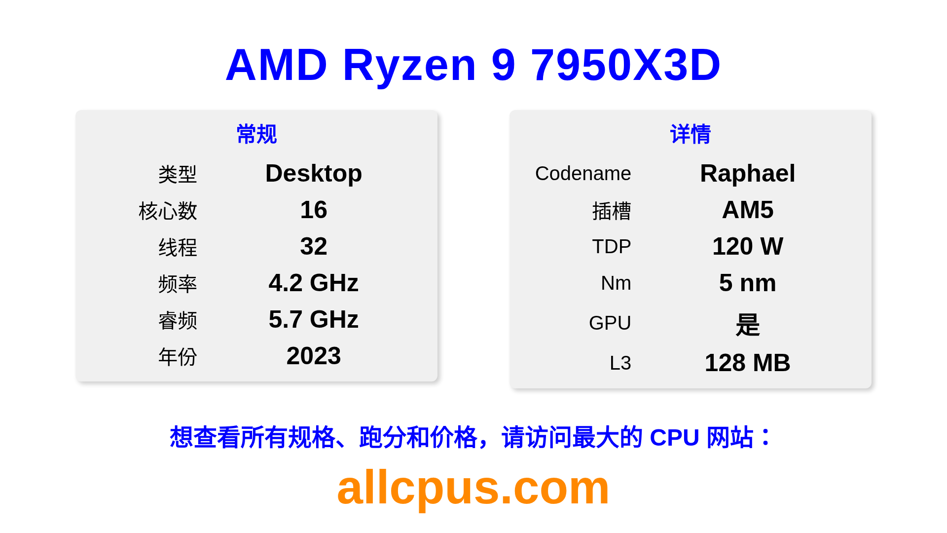 AMD Ryzen 9 7950X3D 是 AMD Ryzen 系列的 桌面处理器,基于 Raphael 架构,于 2023 发布。 这款 CPU 拥有 16 核心,基础频率为 4200 MHz,最高加速频率为 5700 MHz,L3 缓存为 128 MB。 使用 5 nm 工艺制造。AMD Ryzen 9 7950X3D 设计用于 AM5 插槽。支持超频。 包括集成的 AMD Radeon Graphics 显卡。