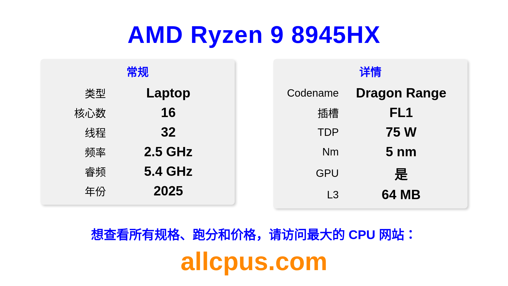 AMD Ryzen 9 8945HX 是 AMD Ryzen 系列的 笔记本处理器,基于 Dragon Range 架构,于 2025 发布。 这款 CPU 拥有 16 核心,基础频率为 2500 MHz,最高加速频率为 5400 MHz,L3 缓存为 64 MB。 使用 5 nm 工艺制造。AMD Ryzen 9 8945HX 设计用于 FL1 插槽。支持超频。 包括集成的 AMD Radeon 610M 显卡。