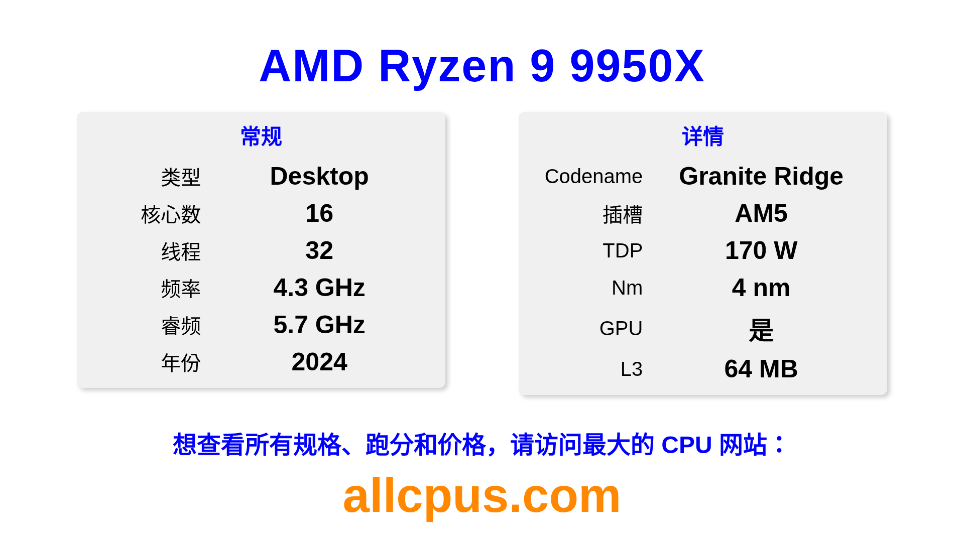 AMD Ryzen 9 9950X 是 AMD Ryzen 系列的 桌面处理器,基于 Granite Ridge 架构,于 2024 发布。 这款 CPU 拥有 16 核心,基础频率为 4300 MHz,最高加速频率为 5700 MHz,L3 缓存为 64 MB。 使用 4 nm 工艺制造。AMD Ryzen 9 9950X 设计用于 AM5 插槽。支持超频。 包括集成的 AMD Radeon Graphics 显卡。
