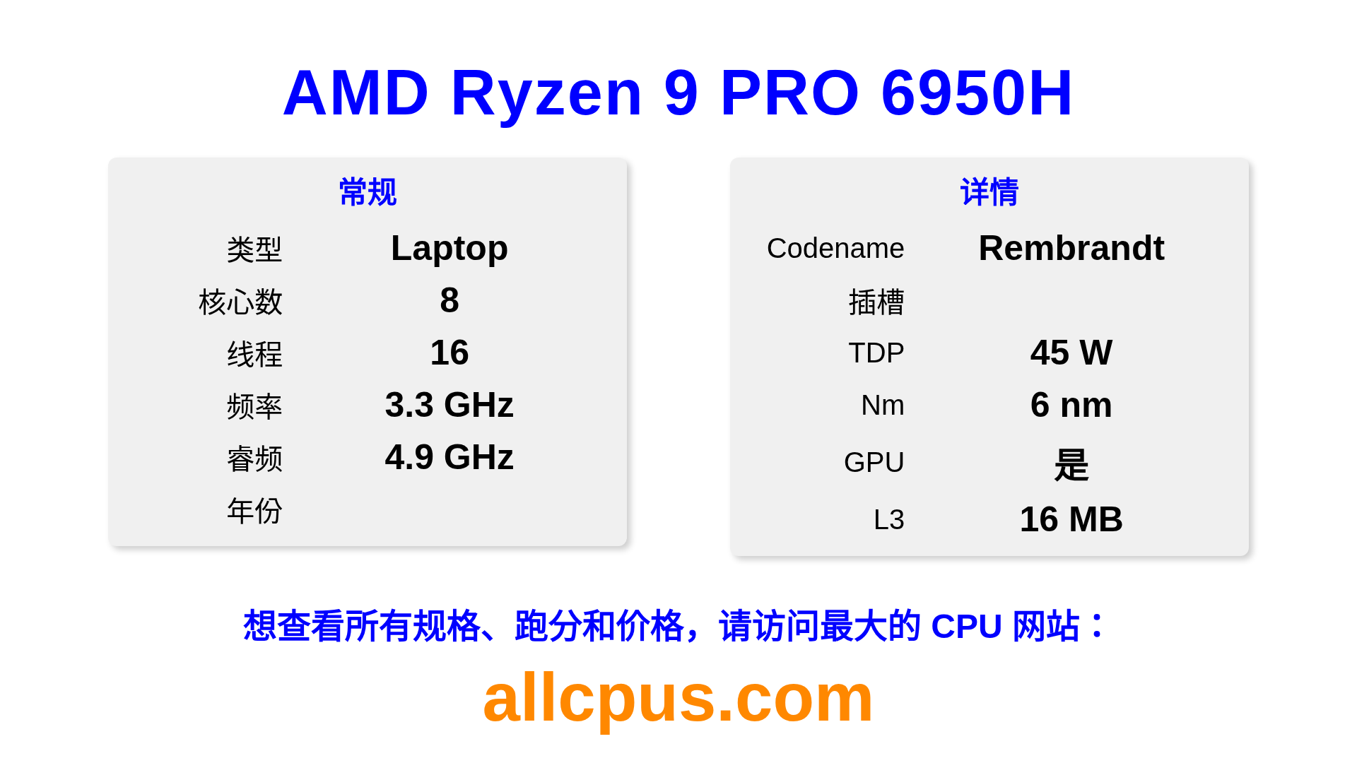 AMD Ryzen 9 PRO 6950H 是 AMD Ryzen PRO 系列的 笔记本处理器,基于 Rembrandt 架构,于 发布。 这款 CPU 拥有 8 核心,基础频率为 3300 MHz,最高加速频率为 4900 MHz,L3 缓存为 16 MB。 使用 6 nm 工艺制造。AMD Ryzen 9 PRO 6950H 设计用于 插槽。 包括集成的 AMD Radeon 680M 显卡。
