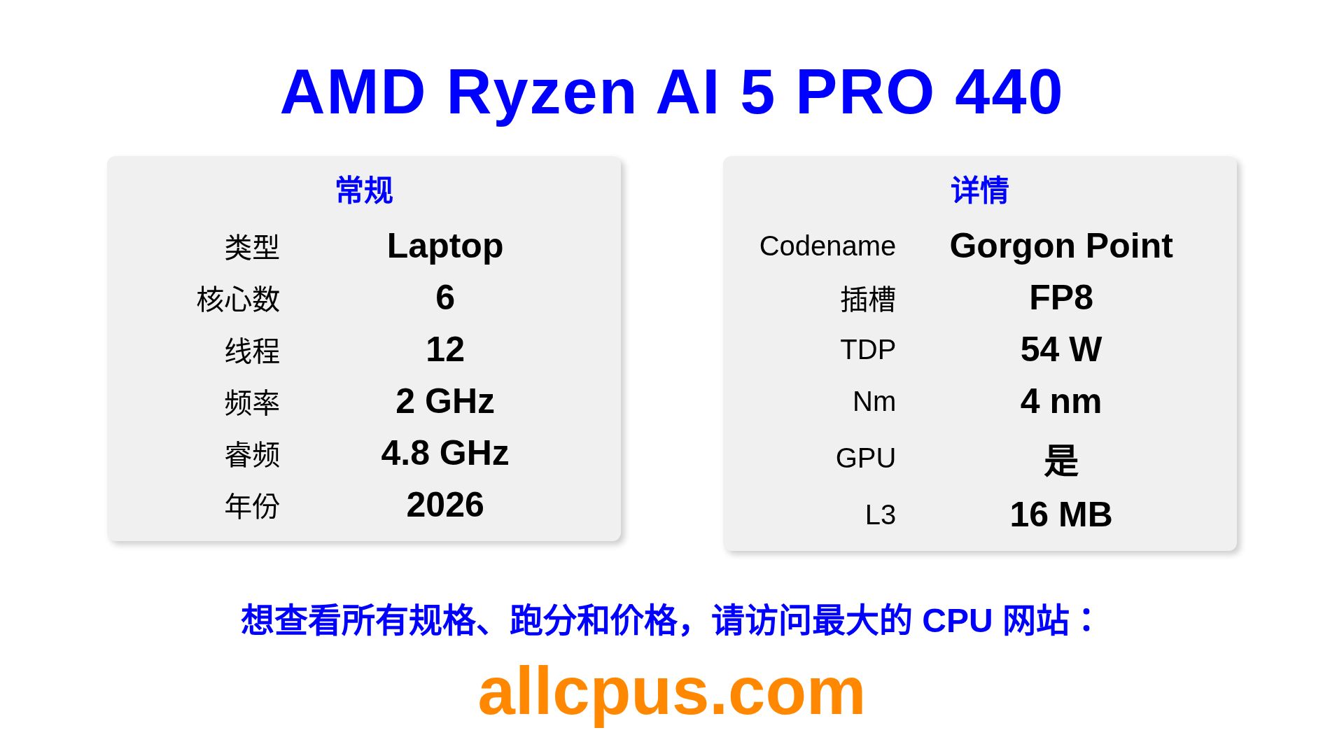 AMD Ryzen AI 5 PRO 440 是 AMD Ryzen PRO 系列的 笔记本处理器,基于 Gorgon Point 架构,于 2026 发布。 这款 CPU 拥有 6 核心,基础频率为 2000 MHz,最高加速频率为 4800 MHz,L3 缓存为 16 MB。 使用 4 nm 工艺制造。AMD Ryzen AI 5 PRO 440 设计用于 FP8 插槽。支持超频。 包括集成的 AMD Radeon 840M 显卡。