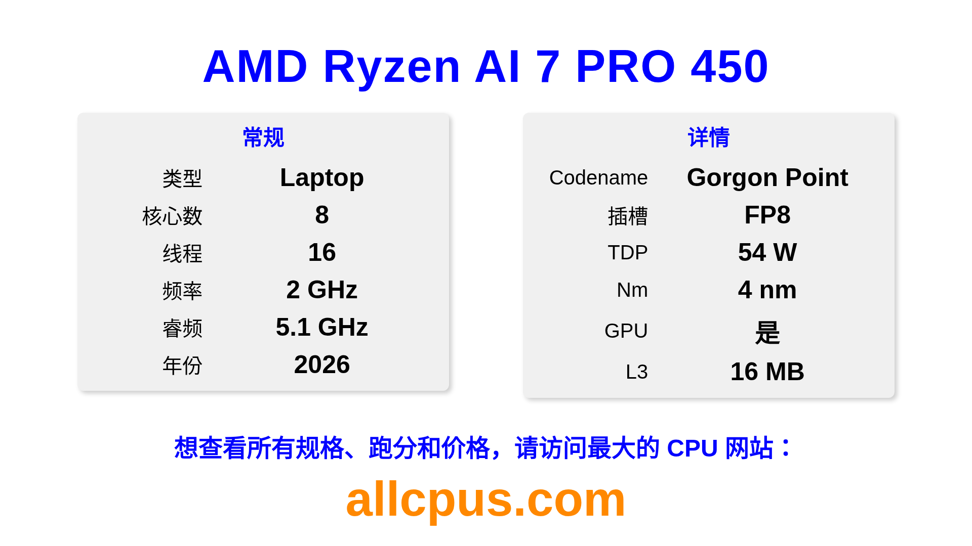 AMD Ryzen AI 7 PRO 450 是 AMD Ryzen PRO 系列的 笔记本处理器,基于 Gorgon Point 架构,于 2026 发布。 这款 CPU 拥有 8 核心,基础频率为 2000 MHz,最高加速频率为 5100 MHz,L3 缓存为 16 MB。 使用 4 nm 工艺制造。AMD Ryzen AI 7 PRO 450 设计用于 FP8 插槽。支持超频。 包括集成的 AMD Radeon 860M 显卡。