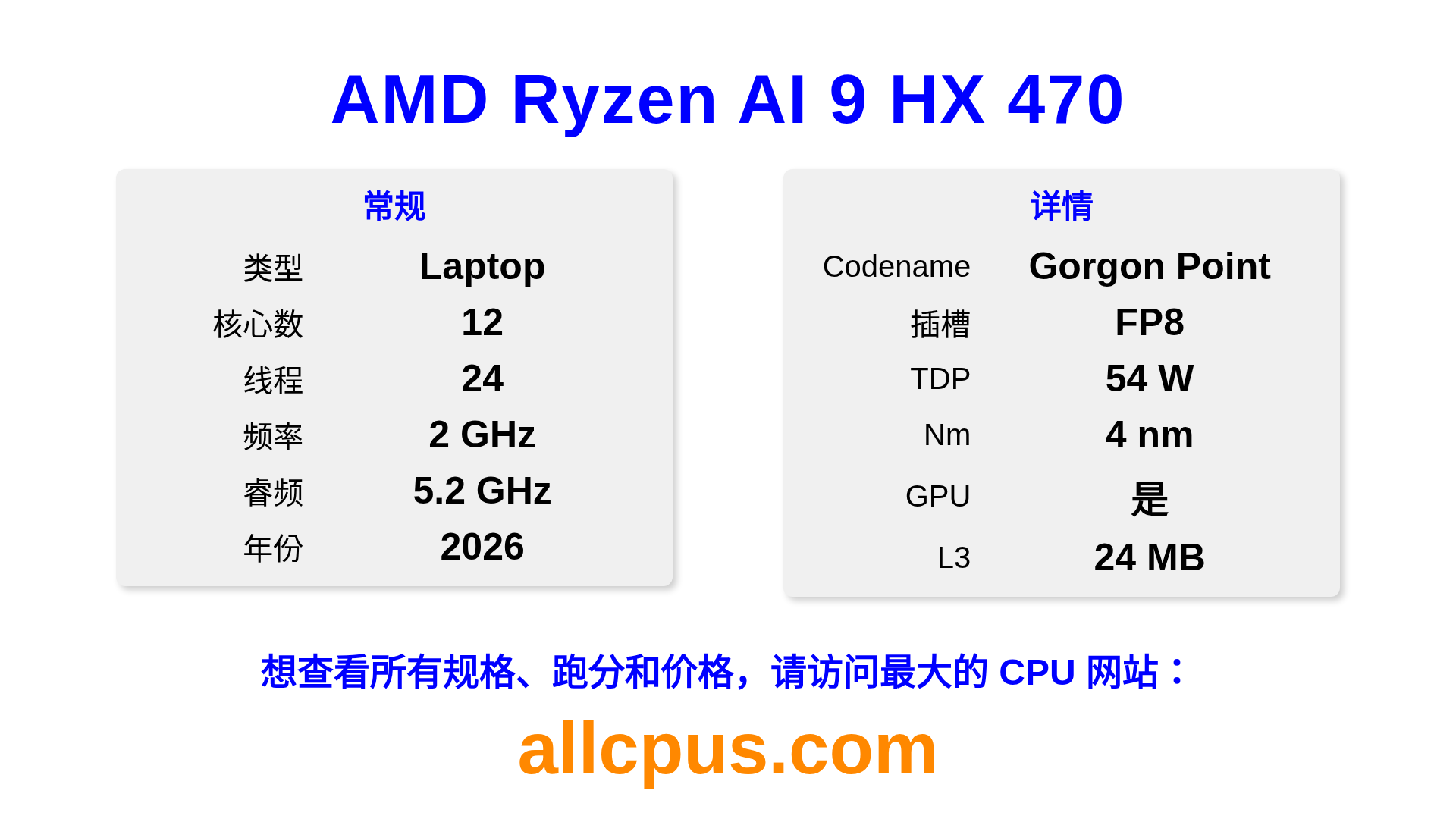 AMD Ryzen AI 9 HX 470 是 AMD Ryzen 系列的 笔记本处理器,基于 Gorgon Point 架构,于 2026 发布。 这款 CPU 拥有 12 核心,基础频率为 2000 MHz,最高加速频率为 5200 MHz,L3 缓存为 24 MB。 使用 4 nm 工艺制造。AMD Ryzen AI 9 HX 470 设计用于 FP8 插槽。支持超频。 包括集成的 AMD Radeon 890M 显卡。