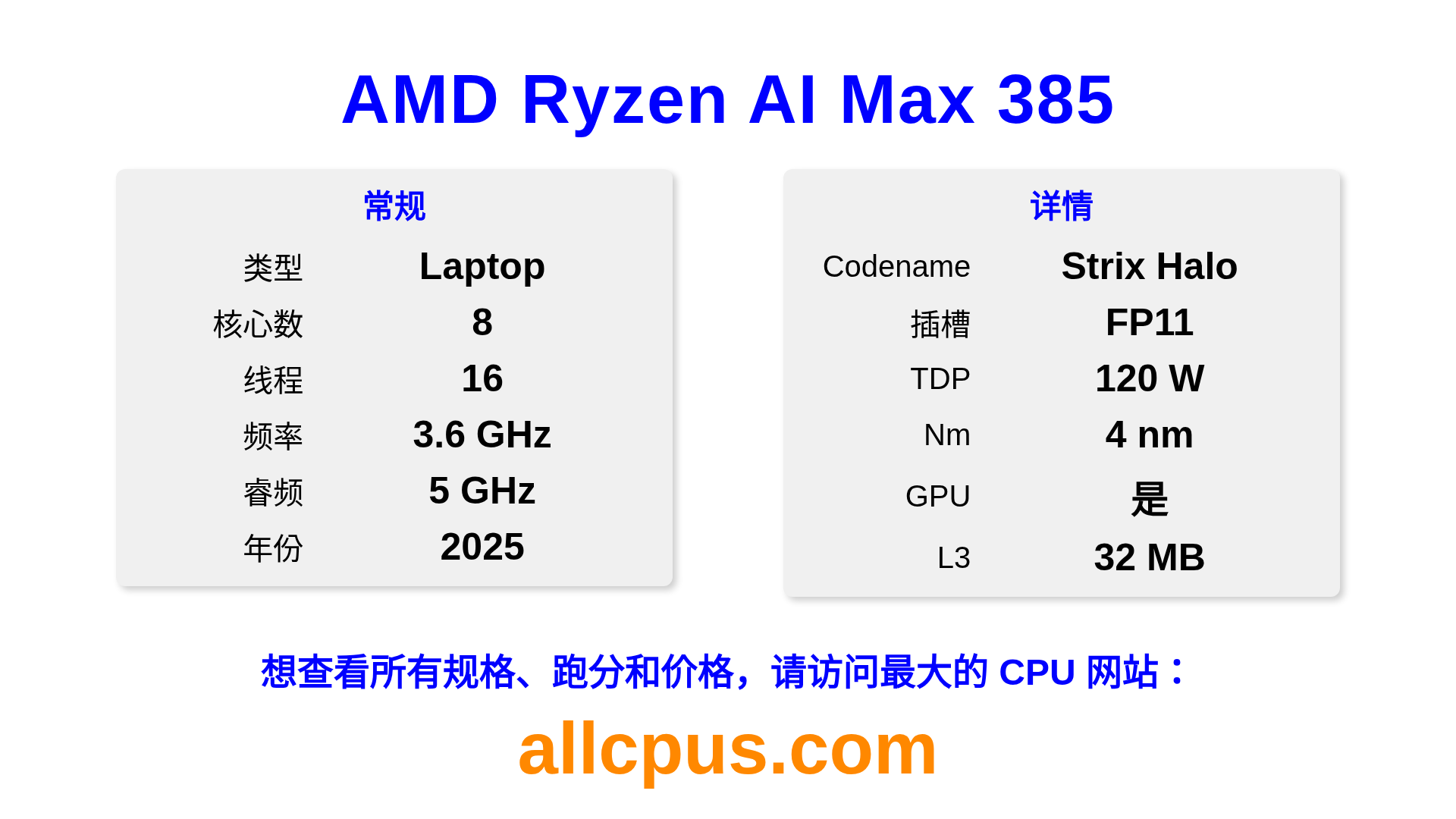 AMD Ryzen AI Max 385 是 AMD Ryzen 系列的 笔记本处理器,基于 Strix Halo 架构,于 2025 发布。 这款 CPU 拥有 8 核心,基础频率为 3600 MHz,最高加速频率为 5000 MHz,L3 缓存为 32 MB。 使用 4 nm 工艺制造。AMD Ryzen AI Max 385 设计用于 FP11 插槽。支持超频。 包括集成的 Radeon 8050S Graphics 显卡。