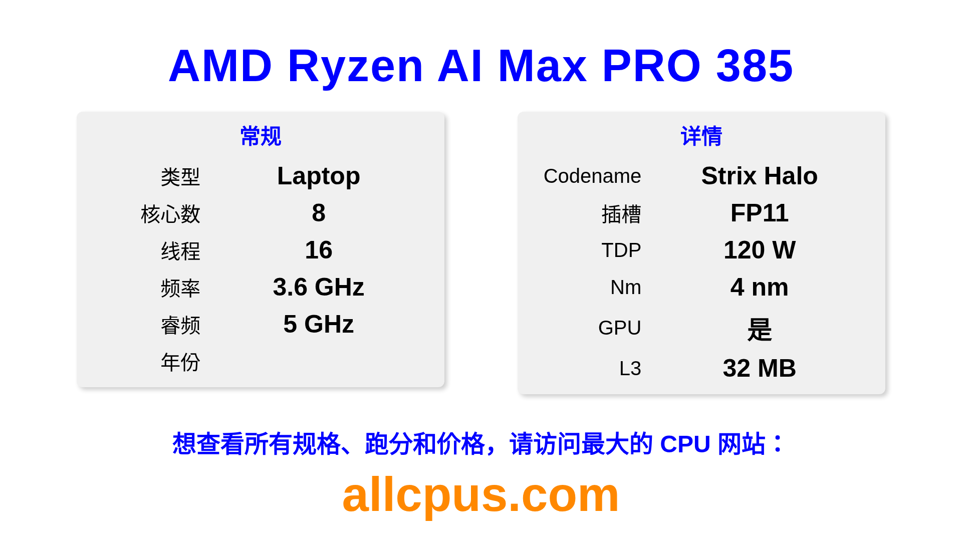 AMD Ryzen AI Max PRO 385 是 AMD Ryzen PRO 系列的 笔记本处理器,基于 Strix Halo 架构,于 发布。 这款 CPU 拥有 8 核心,基础频率为 3600 MHz,最高加速频率为 5000 MHz,L3 缓存为 32 MB。 使用 4 nm 工艺制造。AMD Ryzen AI Max PRO 385 设计用于 FP11 插槽。支持超频。 包括集成的 Radeon 8050S Graphics 显卡。