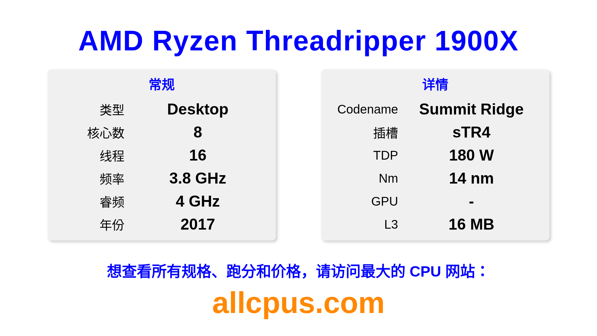 AMD Ryzen Threadripper 1900X 是 AMD Ryzen Threadripper 系列的 桌面处理器,基于 Summit Ridge 架构,于 2017 发布。 这款 CPU 拥有 8 核心,基础频率为 3800 MHz,最高加速频率为 4000 MHz,L3 缓存为 16 MB。 使用 14 nm 工艺制造。AMD Ryzen Threadripper 1900X 设计用于 sTR4 插槽。支持超频。 需要独立显卡。