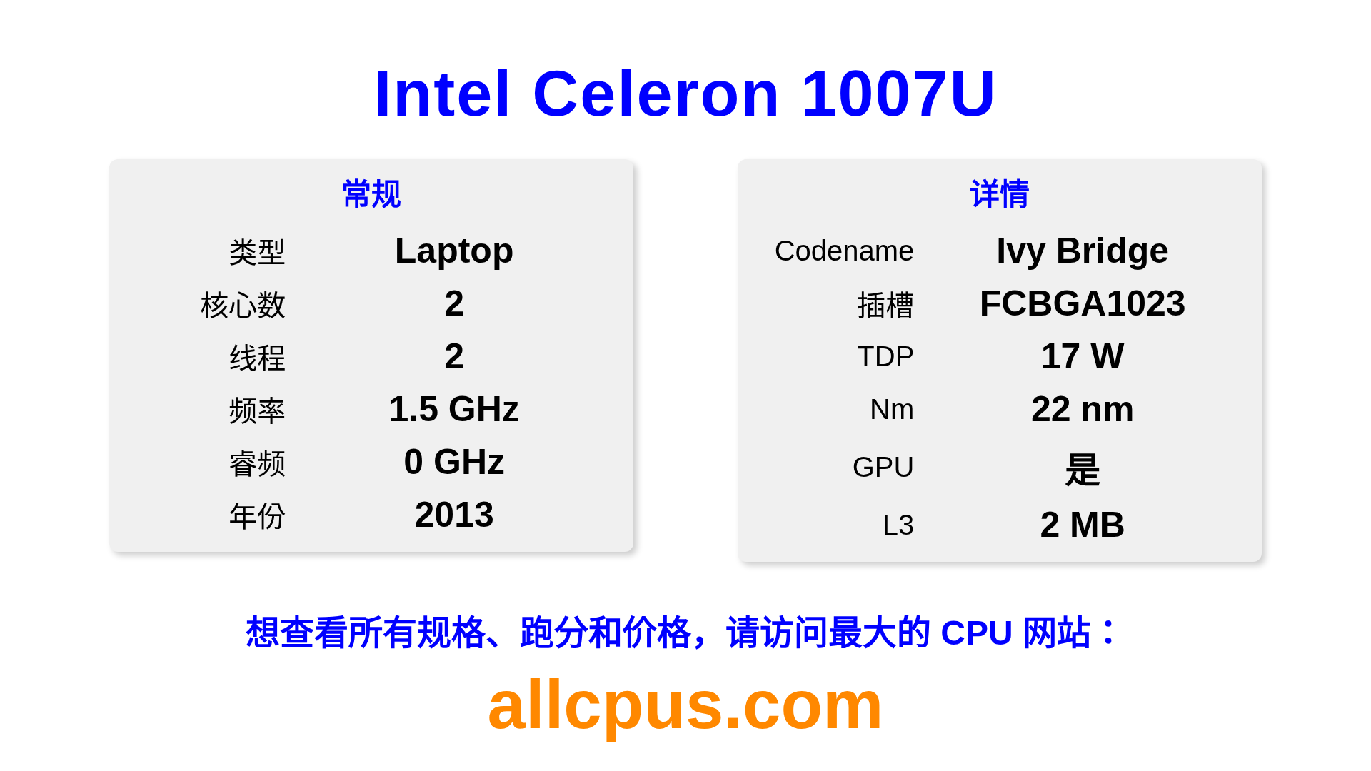 Intel Celeron 1007U 是 Intel Intel® Celeron® 系列的 笔记本处理器,基于 Ivy Bridge 架构,于 2013 发布。 这款 CPU 拥有 2 核心,基础频率为 1500 MHz,最高加速频率为 0 MHz,L3 缓存为 2 MB。 使用 22 nm 工艺制造。Intel Celeron 1007U 设计用于 BGA1023 插槽。 包括集成的 Intel® HD Graphics for 3rd Generation Intel® Processors 显卡。