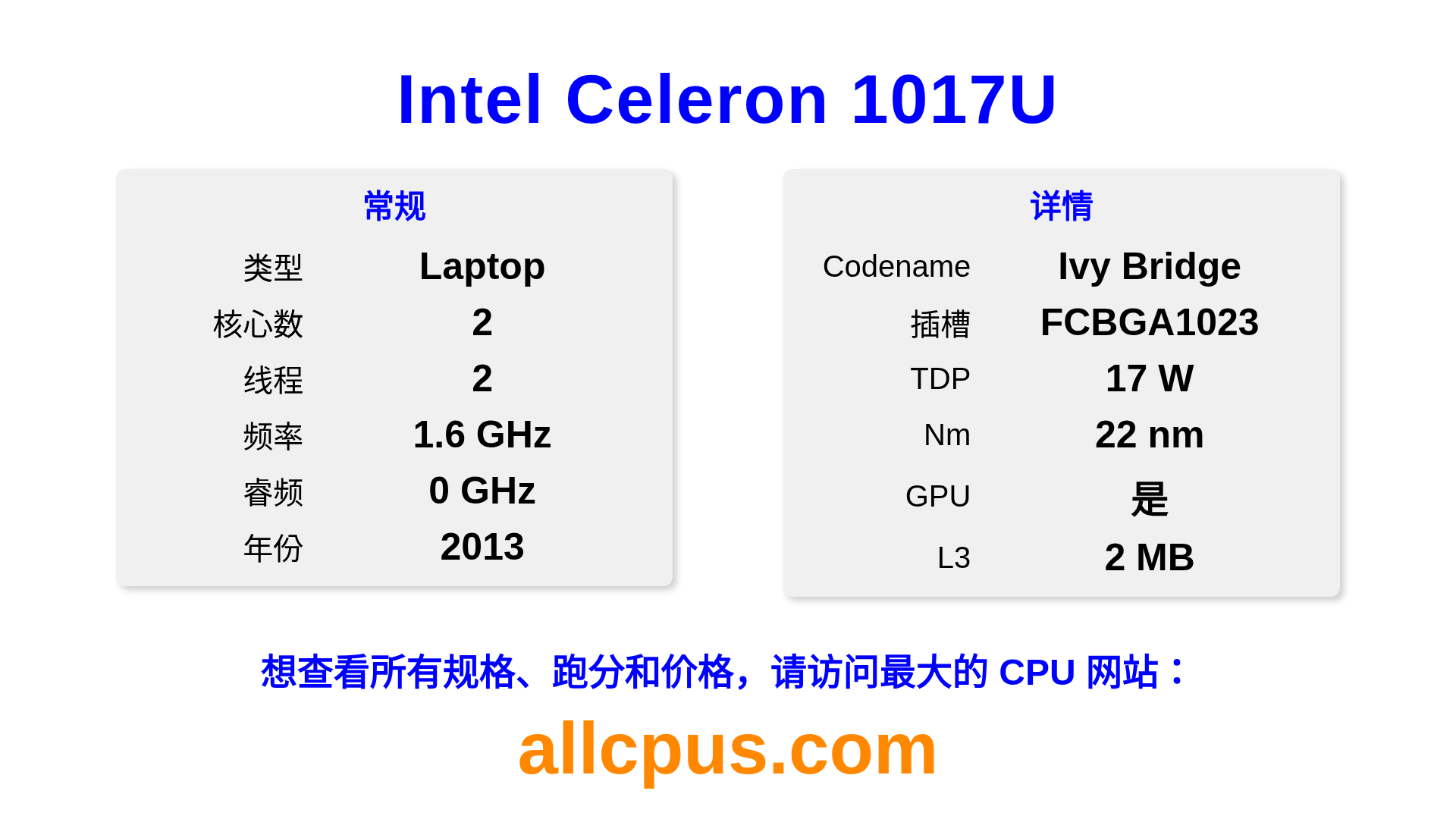 Intel Celeron 1017U 是 Intel Intel® Celeron® 系列的 笔记本处理器,基于 Ivy Bridge 架构,于 2013 发布。 这款 CPU 拥有 2 核心,基础频率为 1600 MHz,最高加速频率为 0 MHz,L3 缓存为 2 MB。 使用 22 nm 工艺制造。Intel Celeron 1017U 设计用于 BGA1023 插槽。 包括集成的 Intel® HD Graphics for 3rd Generation Intel® Processors 显卡。