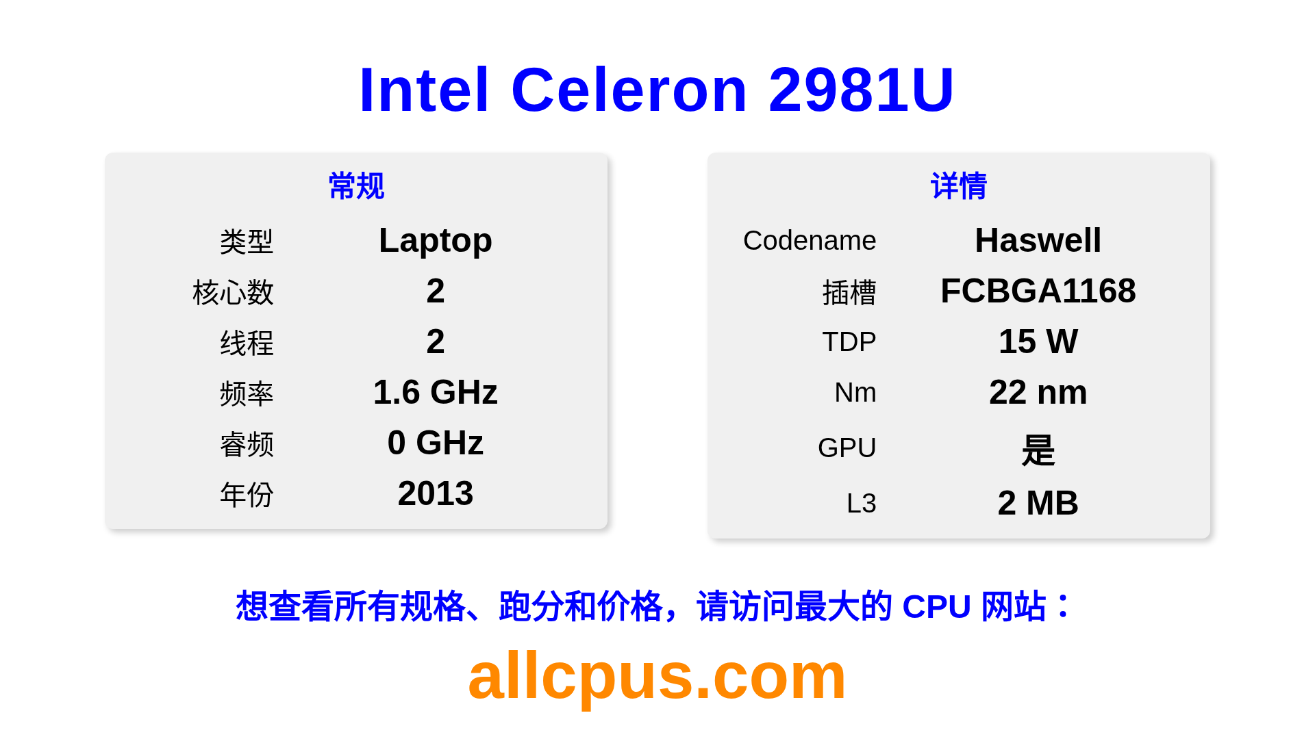 Intel Celeron 2981U 是 Intel Intel® Celeron® 系列的 笔记本处理器,基于 Haswell 架构,于 2013 发布。 这款 CPU 拥有 2 核心,基础频率为 1600 MHz,最高加速频率为 0 MHz,L3 缓存为 2 MB。 使用 22 nm 工艺制造。Intel Celeron 2981U 设计用于 BGA1168 插槽。 包括集成的 Intel® HD Graphics for 4th Generation Intel® Processors 显卡。