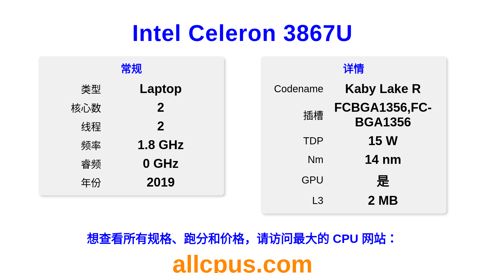 Intel Celeron 3867U 是 Intel Intel® Celeron® 系列的 笔记本处理器,基于 Kaby Lake R 架构,于 2019 发布。 这款 CPU 拥有 2 核心,基础频率为 1800 MHz,最高加速频率为 0 MHz,L3 缓存为 2 MB。 使用 14 nm 工艺制造。Intel Celeron 3867U 设计用于 BGA1356,FC-BGA1356 插槽。 包括集成的 Intel® HD Graphics 610 显卡。