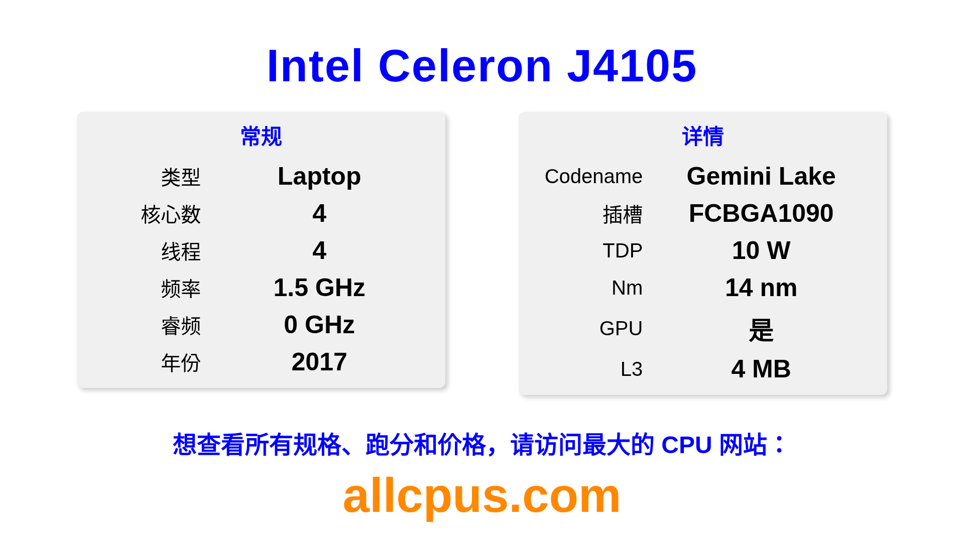 Intel Celeron J4105 是 Intel Intel® Celeron® 系列的 笔记本处理器,基于 Gemini Lake 架构,于 2017 发布。 这款 CPU 拥有 4 核心,基础频率为 1500 MHz,最高加速频率为 0 MHz,L3 缓存为 4 MB。 使用 14 nm 工艺制造。Intel Celeron J4105 设计用于 BGA1090 插槽。 包括集成的 Intel® UHD Graphics 600 显卡。