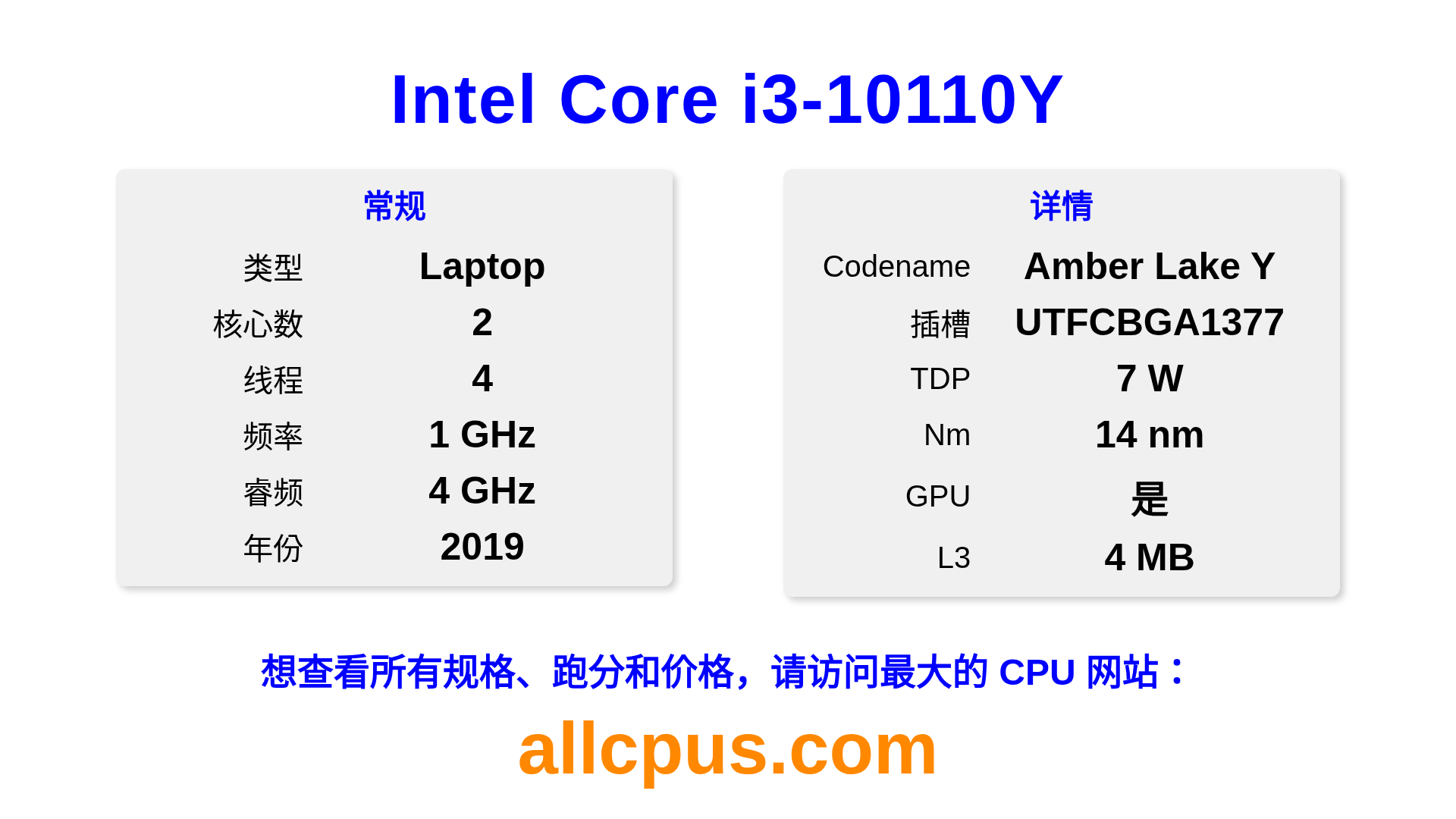 Intel Core i3-10110Y 是 Intel Intel Core 系列的 笔记本处理器,基于 Amber Lake Y 架构,于 2019 发布。 这款 CPU 拥有 2 核心,基础频率为 1000 MHz,最高加速频率为 4000 MHz,L3 缓存为 4 MB。 使用 14 nm 工艺制造。Intel Core i3-10110Y 设计用于 UTFCBGA1377 插槽。 包括集成的 Intel® UHD Graphics for 10th Gen Intel® Processors 显卡。