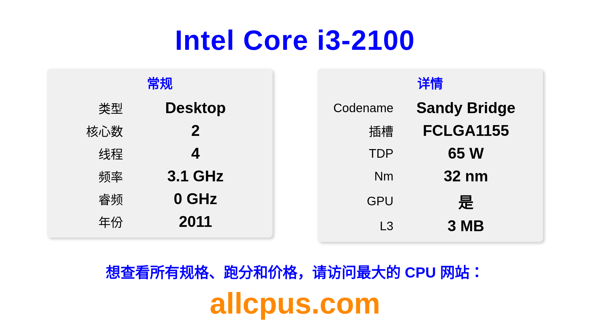 Intel Core i3-2100 是 Intel Intel Core 系列的 桌面处理器,基于 Sandy Bridge 架构,于 2011 发布。 这款 CPU 拥有 2 核心,基础频率为 3100 MHz,最高加速频率为 0 MHz,L3 缓存为 3 MB。 使用 32 nm 工艺制造。Intel Core i3-2100 设计用于 LGA1155 插槽。 包括集成的 Intel® HD Graphics 2000 显卡。