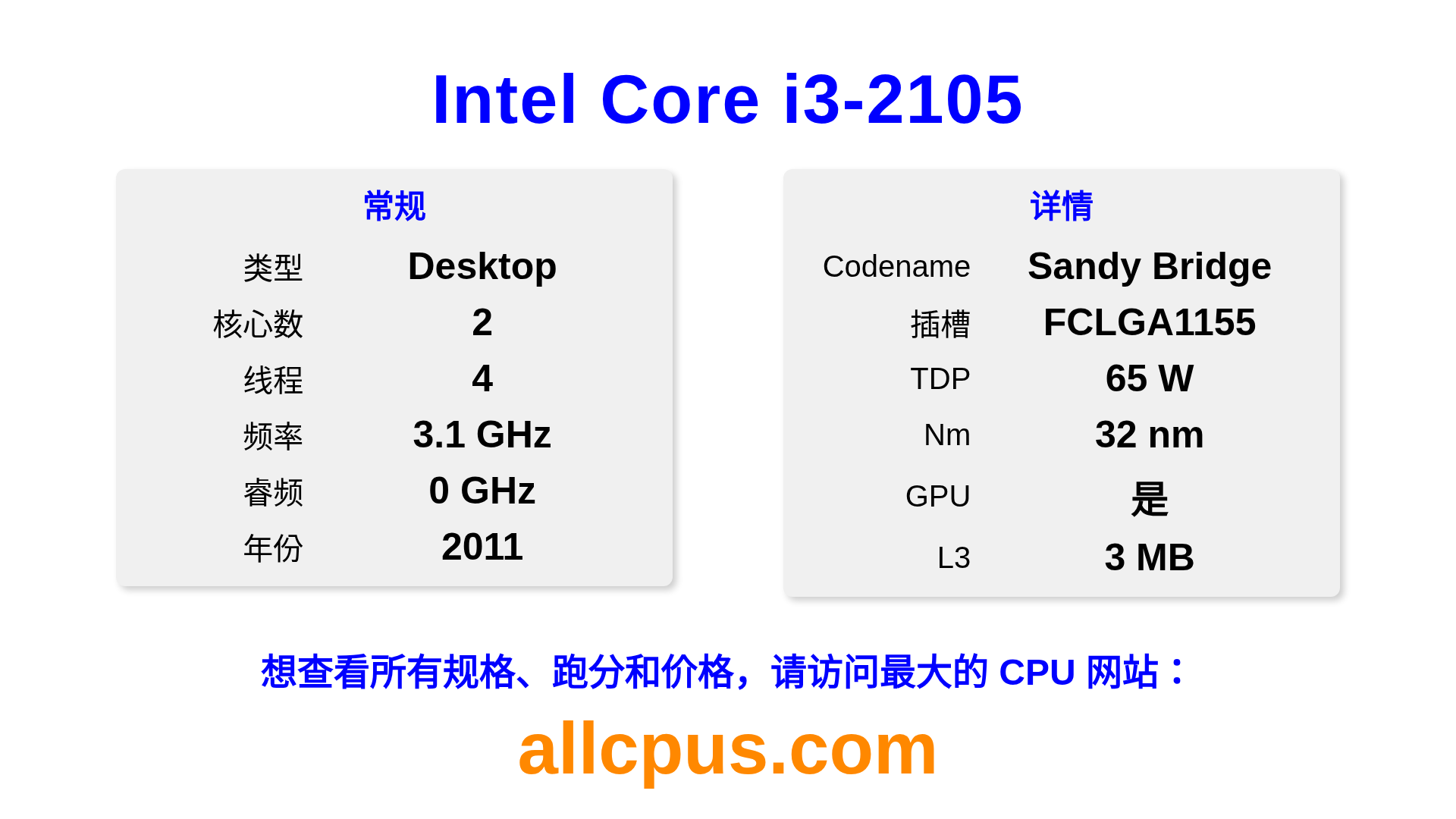Intel Core i3-2105 是 Intel Intel Core 系列的 桌面处理器,基于 Sandy Bridge 架构,于 2011 发布。 这款 CPU 拥有 2 核心,基础频率为 3100 MHz,最高加速频率为 0 MHz,L3 缓存为 3 MB。 使用 32 nm 工艺制造。Intel Core i3-2105 设计用于 LGA1155 插槽。 包括集成的 Intel® HD Graphics 3000 显卡。