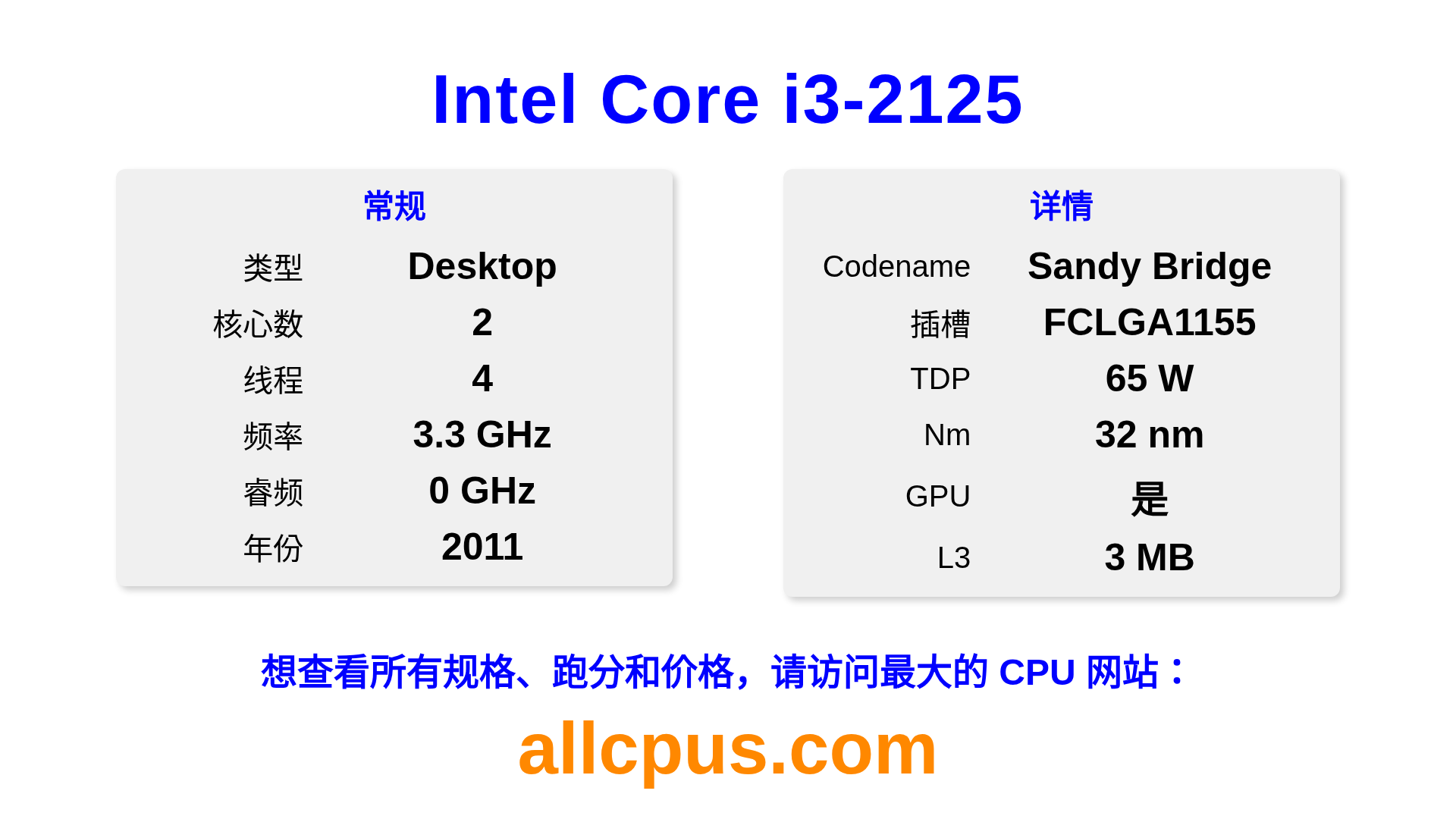 Intel Core i3-2125 是 Intel Intel Core 系列的 桌面处理器,基于 Sandy Bridge 架构,于 2011 发布。 这款 CPU 拥有 2 核心,基础频率为 3300 MHz,最高加速频率为 0 MHz,L3 缓存为 3 MB。 使用 32 nm 工艺制造。Intel Core i3-2125 设计用于 LGA1155 插槽。 包括集成的 Intel® HD Graphics 3000 显卡。