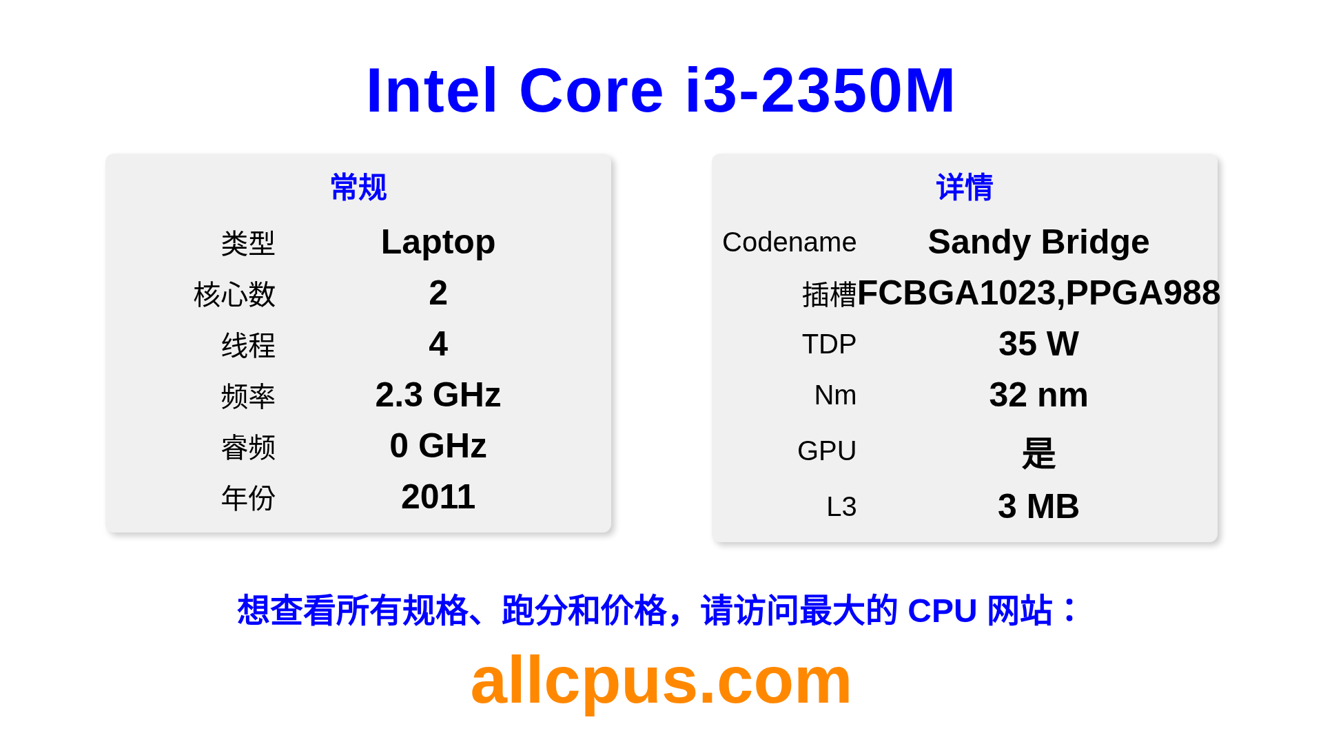 Intel Core i3-2350M 是 Intel Intel Core 系列的 笔记本处理器,基于 Sandy Bridge 架构,于 2011 发布。 这款 CPU 拥有 2 核心,基础频率为 2300 MHz,最高加速频率为 0 MHz,L3 缓存为 3 MB。 使用 32 nm 工艺制造。Intel Core i3-2350M 设计用于 BGA1023,PPGA988 插槽。 包括集成的 Intel® HD Graphics 3000 显卡。