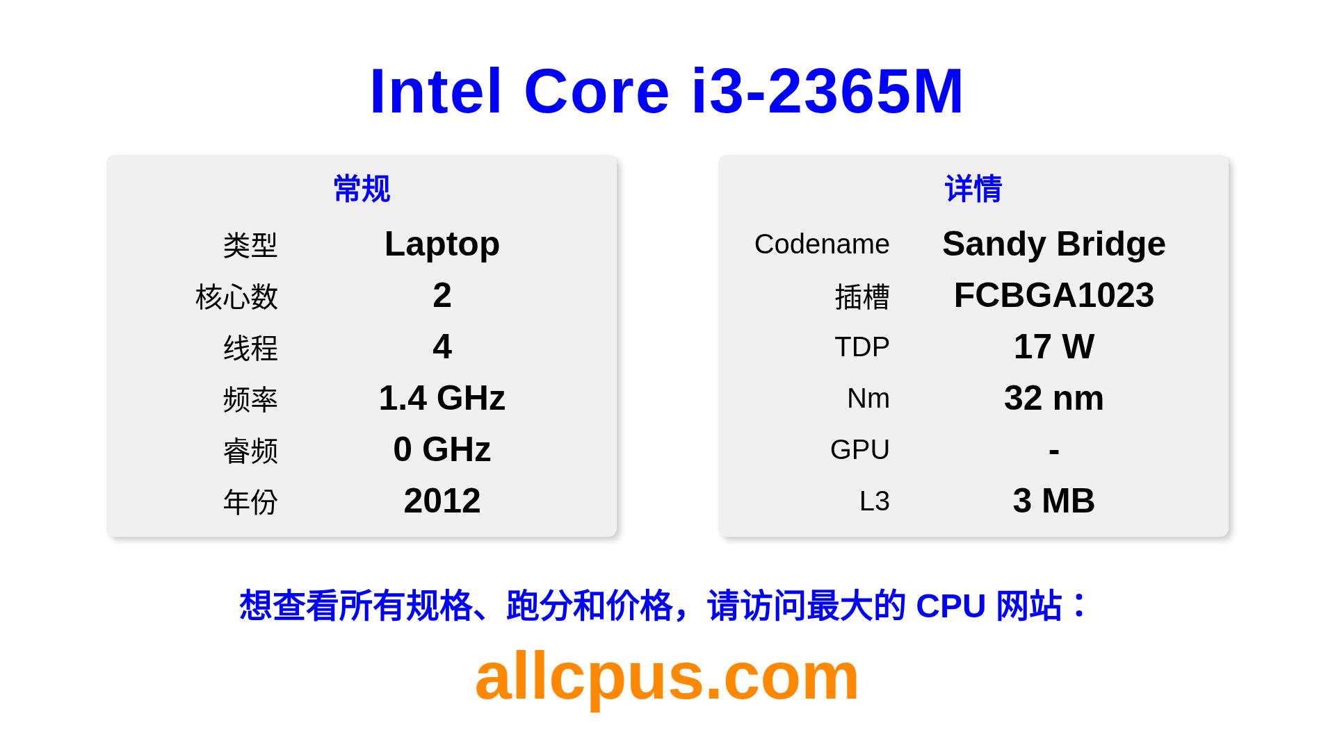 Intel Core i3-2365M 是 Intel Intel Core 系列的 笔记本处理器,基于 Sandy Bridge 架构,于 2012 发布。 这款 CPU 拥有 2 核心,基础频率为 1400 MHz,最高加速频率为 0 MHz,L3 缓存为 3 MB。 使用 32 nm 工艺制造。Intel Core i3-2365M 设计用于 BGA1023 插槽。 需要独立显卡。