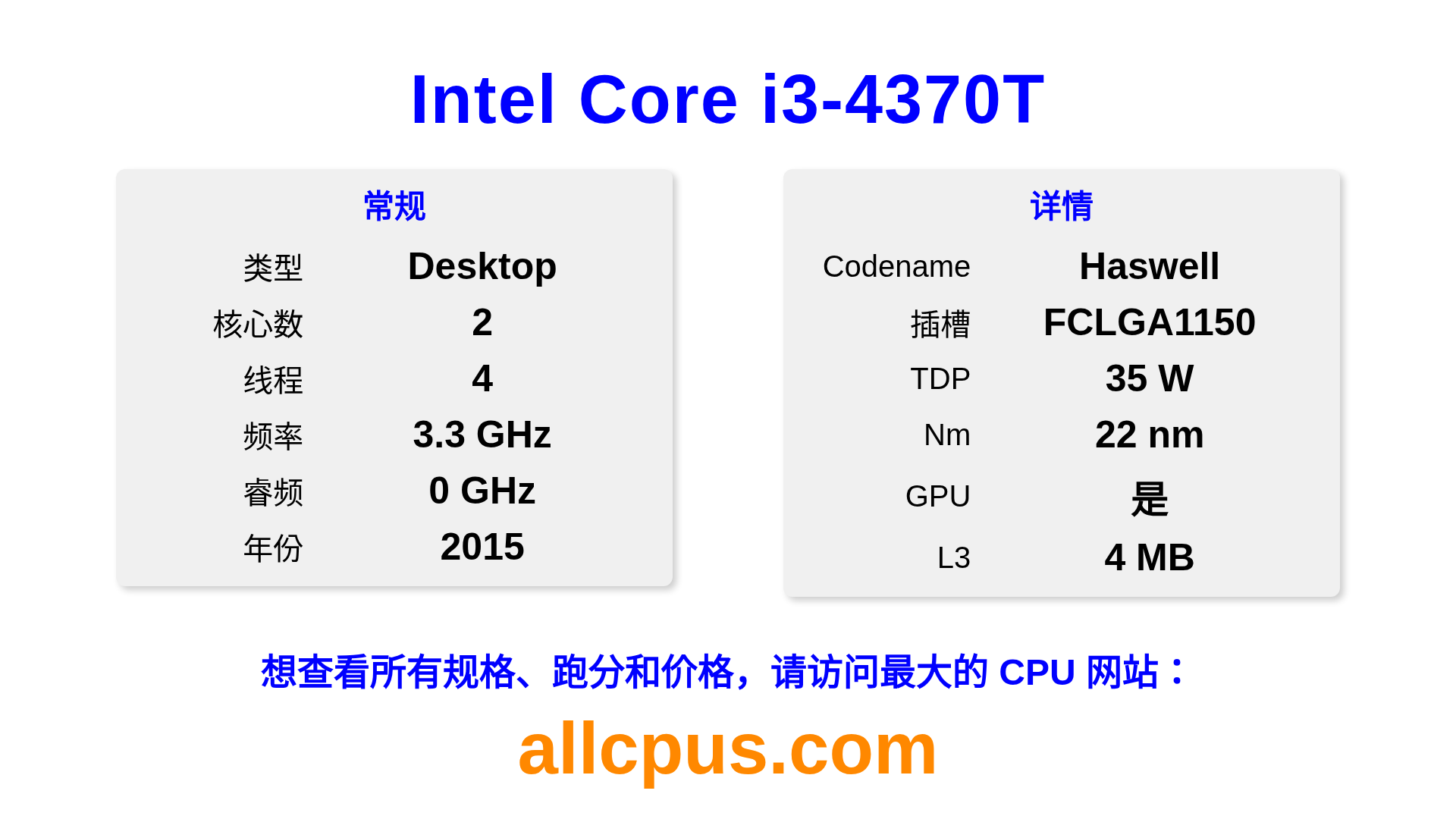 Intel Core i3-4370T 是 Intel Intel Core 系列的 桌面处理器,基于 Haswell 架构,于 2015 发布。 这款 CPU 拥有 2 核心,基础频率为 3300 MHz,最高加速频率为 0 MHz,L3 缓存为 4 MB。 使用 22 nm 工艺制造。Intel Core i3-4370T 设计用于 LGA1150 插槽。 包括集成的 Intel® HD Graphics 4600 显卡。