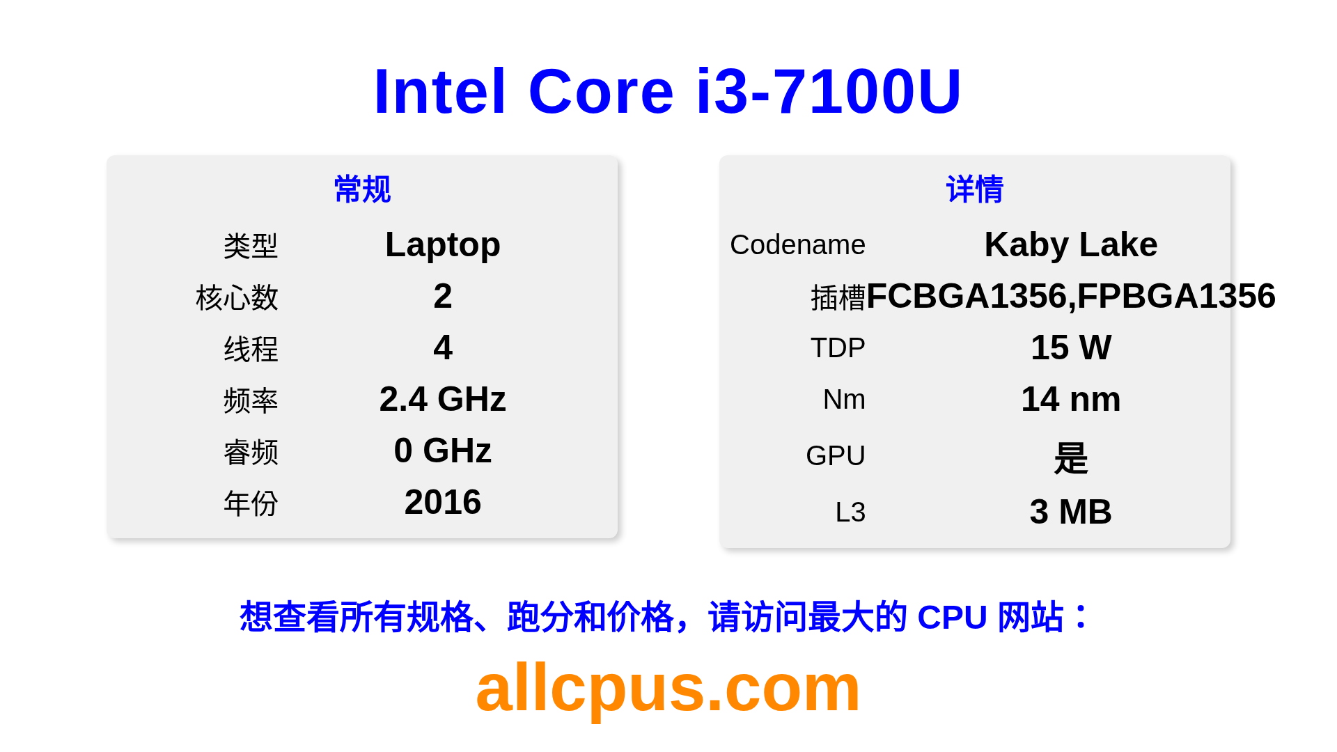 Intel Core i3-7100U 是 Intel Intel Core 系列的 笔记本处理器,基于 Kaby Lake 架构,于 2016 发布。 这款 CPU 拥有 2 核心,基础频率为 2400 MHz,最高加速频率为 0 MHz,L3 缓存为 3 MB。 使用 14 nm 工艺制造。Intel Core i3-7100U 设计用于 BGA1356,FPBGA1356 插槽。 包括集成的 Intel® HD Graphics 620 显卡。