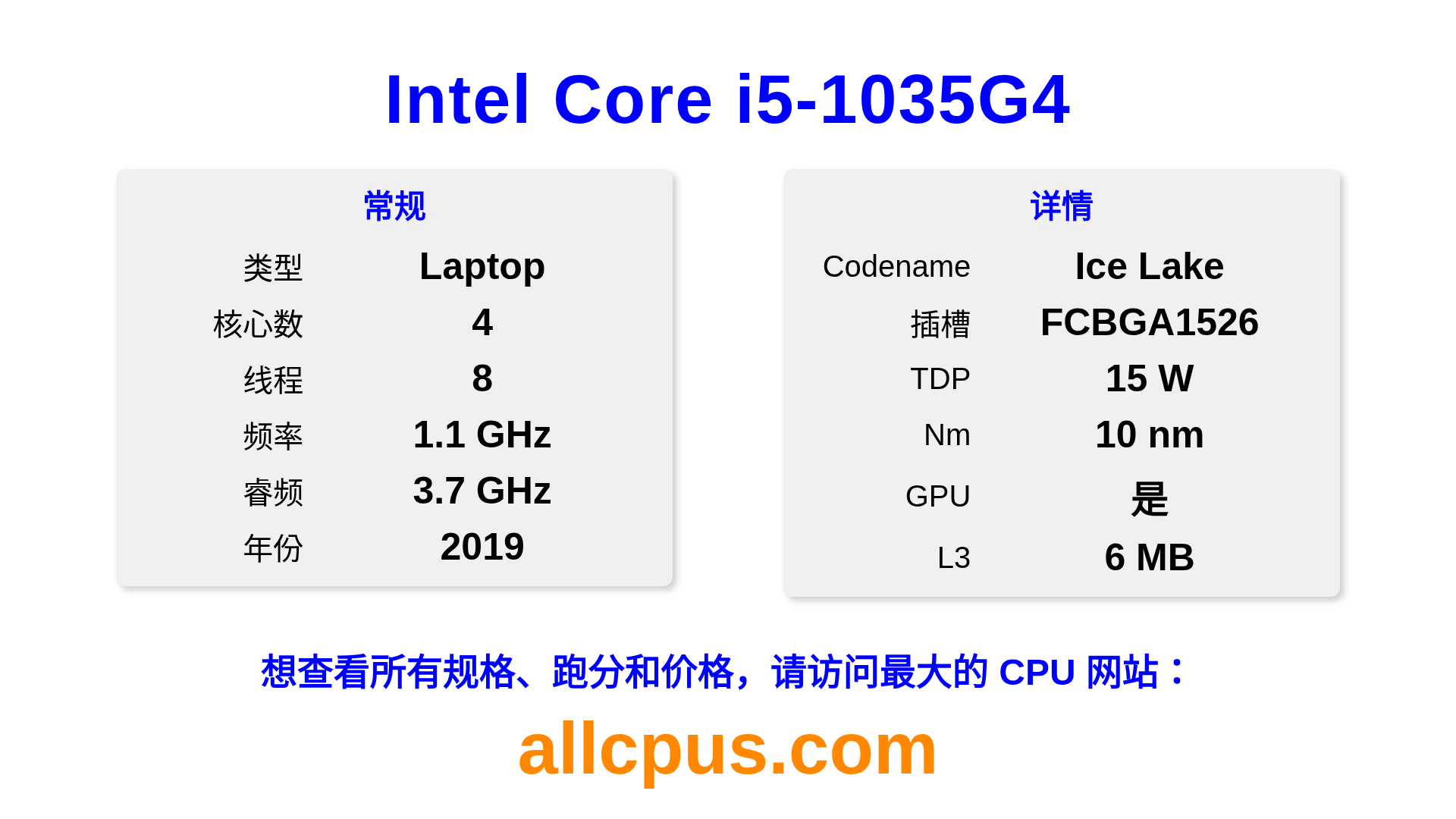 Intel Core i5-1035G4 是 Intel Intel Core 系列的 笔记本处理器,基于 Ice Lake 架构,于 2019 发布。 这款 CPU 拥有 4 核心,基础频率为 1100 MHz,最高加速频率为 3700 MHz,L3 缓存为 6 MB。 使用 10 nm 工艺制造。Intel Core i5-1035G4 设计用于 BGA1526 插槽。 包括集成的 Intel® Iris® Plus Graphics 显卡。