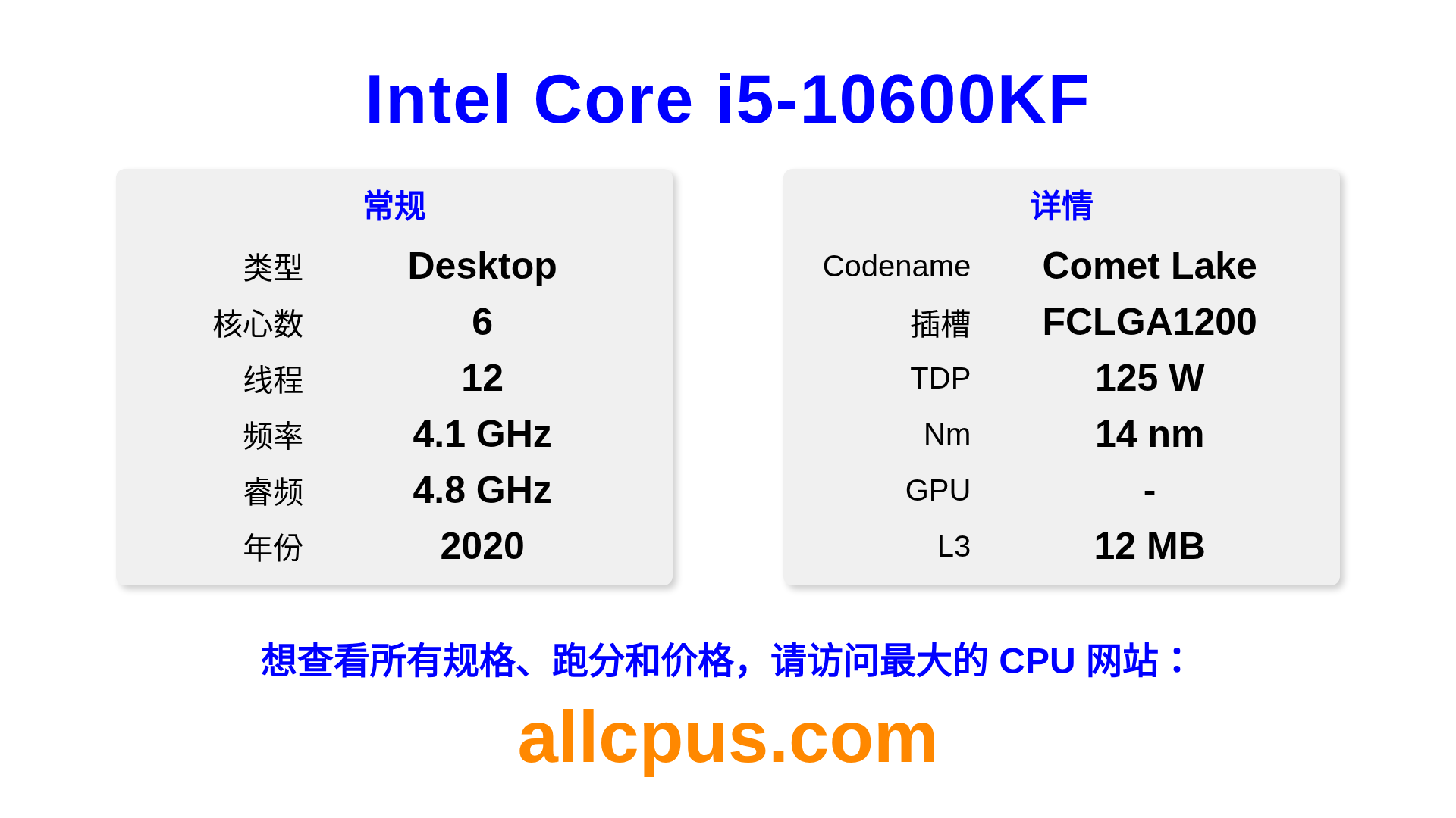 Intel Core i5-10600KF 是 Intel Intel Core 系列的 桌面处理器,基于 Comet Lake 架构,于 2020 发布。 这款 CPU 拥有 6 核心,基础频率为 4100 MHz,最高加速频率为 4800 MHz,L3 缓存为 12 MB。 使用 14 nm 工艺制造。Intel Core i5-10600KF 设计用于 LGA1200 插槽。 需要独立显卡。
