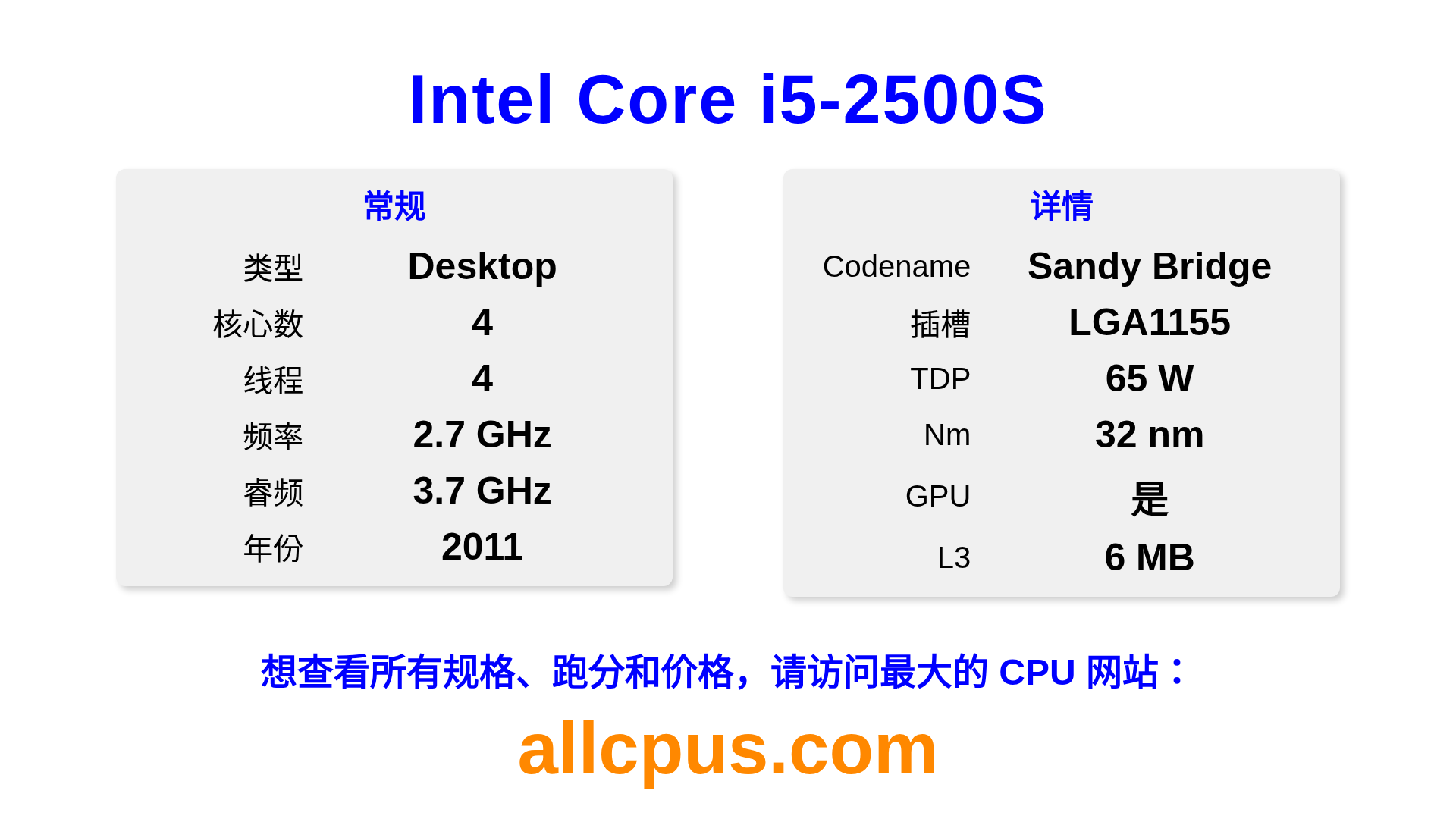 Intel Core i5-2500S 是 Intel Intel Core 系列的 桌面处理器,基于 Sandy Bridge 架构,于 2011 发布。 这款 CPU 拥有 4 核心,基础频率为 2700 MHz,最高加速频率为 3700 MHz,L3 缓存为 6 MB。 使用 32 nm 工艺制造。Intel Core i5-2500S 设计用于 LGA1155 插槽。 包括集成的 Intel® HD Graphics 2000 显卡。