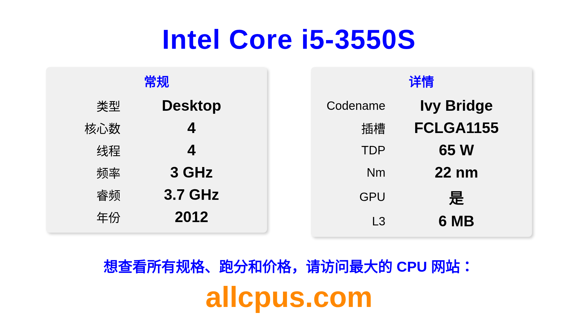 Intel Core i5-3550S 是 Intel Intel Core 系列的 桌面处理器,基于 Ivy Bridge 架构,于 2012 发布。 这款 CPU 拥有 4 核心,基础频率为 3000 MHz,最高加速频率为 3700 MHz,L3 缓存为 6 MB。 使用 22 nm 工艺制造。Intel Core i5-3550S 设计用于 LGA1155 插槽。 包括集成的 Intel® HD Graphics 2500 显卡。