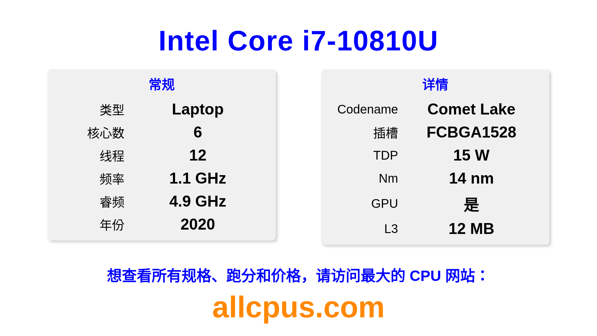 Intel Core i7-10810U 是 Intel Intel Core 系列的 笔记本处理器,基于 Comet Lake 架构,于 2020 发布。 这款 CPU 拥有 6 核心,基础频率为 1100 MHz,最高加速频率为 4900 MHz,L3 缓存为 12 MB。 使用 14 nm 工艺制造。Intel Core i7-10810U 设计用于 BGA1528 插槽。 包括集成的 Intel® UHD Graphics for 10th Gen Intel® Processors 显卡。