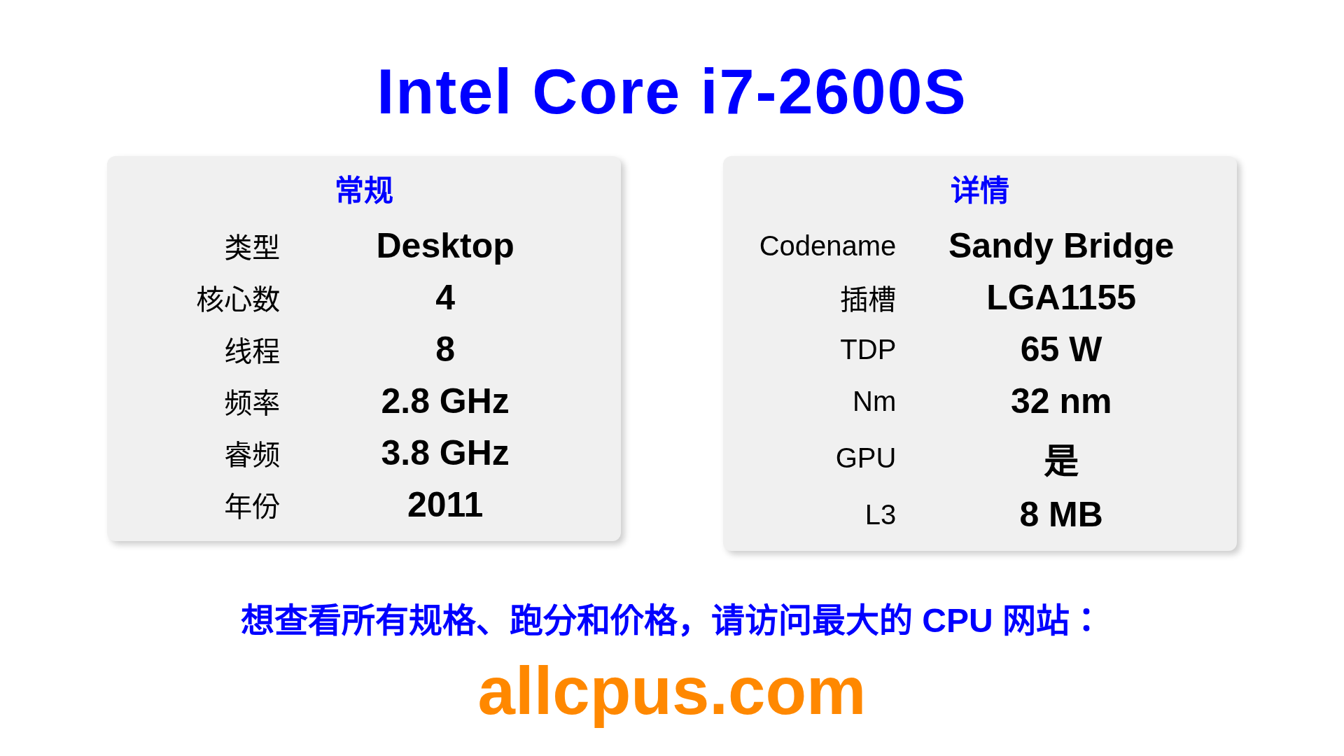 Intel Core i7-2600S 是 Intel Intel Core 系列的 桌面处理器,基于 Sandy Bridge 架构,于 2011 发布。 这款 CPU 拥有 4 核心,基础频率为 2800 MHz,最高加速频率为 3800 MHz,L3 缓存为 8 MB。 使用 32 nm 工艺制造。Intel Core i7-2600S 设计用于 LGA1155 插槽。 包括集成的 Intel® HD Graphics 2000 显卡。