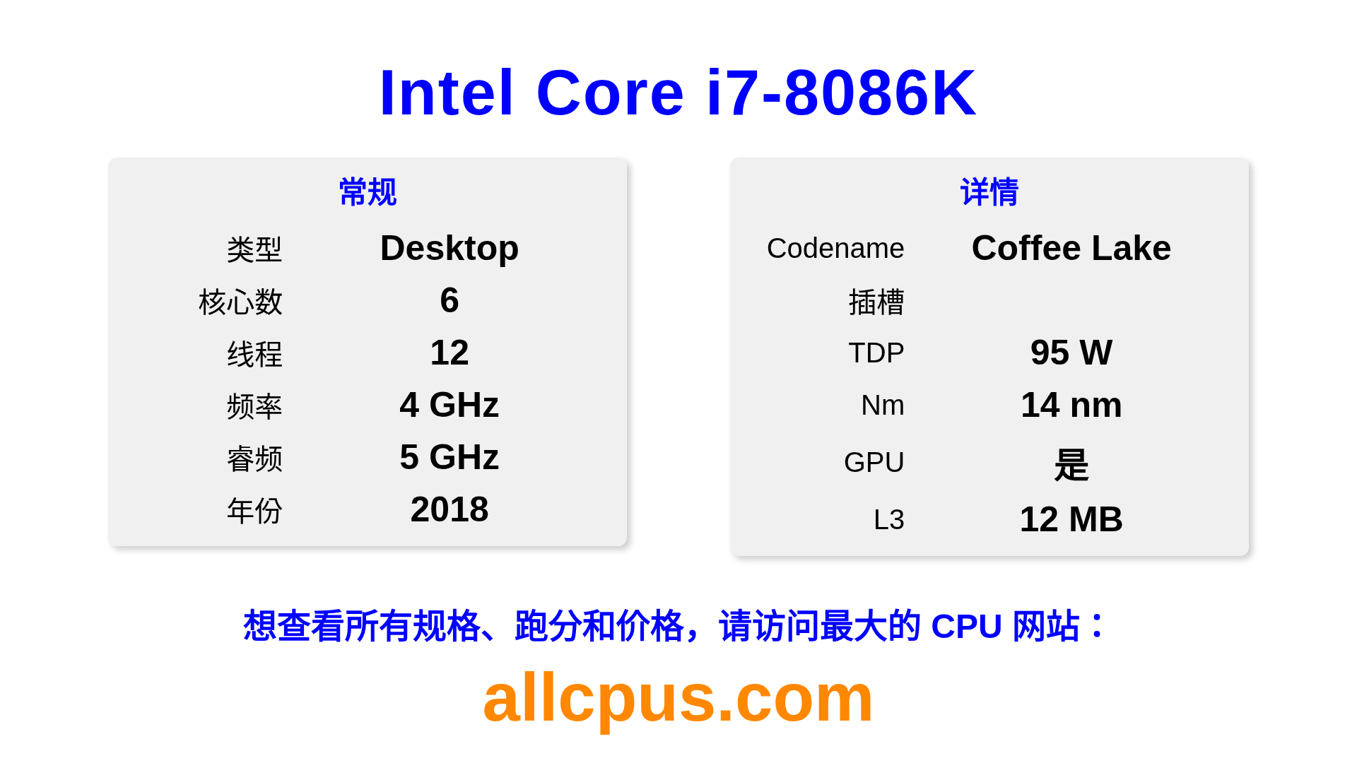 Intel Core i7-8086K 是 Intel Intel Core 系列的 桌面处理器,基于 Coffee Lake 架构,于 2018 发布。 这款 CPU 拥有 6 核心,基础频率为 4000 MHz,最高加速频率为 5000 MHz,L3 缓存为 12 MB。 使用 14 nm 工艺制造。Intel Core i7-8086K 设计用于 插槽。支持超频。 包括集成的 Intel® UHD Graphics 630 显卡。