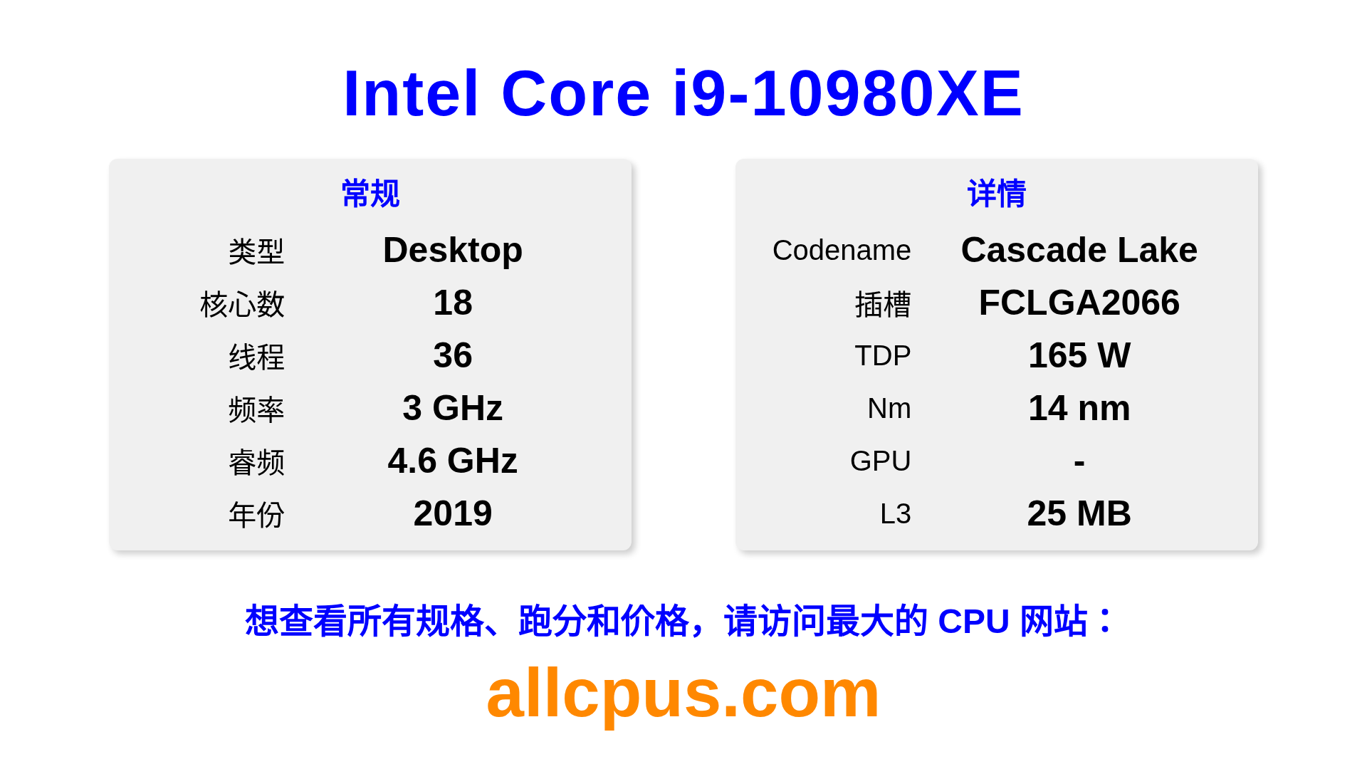 Intel Core i9-10980XE 是 Intel Intel Core 系列的 桌面处理器,基于 Cascade Lake 架构,于 2019 发布。 这款 CPU 拥有 18 核心,基础频率为 3000 MHz,最高加速频率为 4600 MHz,L3 缓存为 25 MB。 使用 14 nm 工艺制造。Intel Core i9-10980XE 设计用于 LGA2066 插槽。 需要独立显卡。