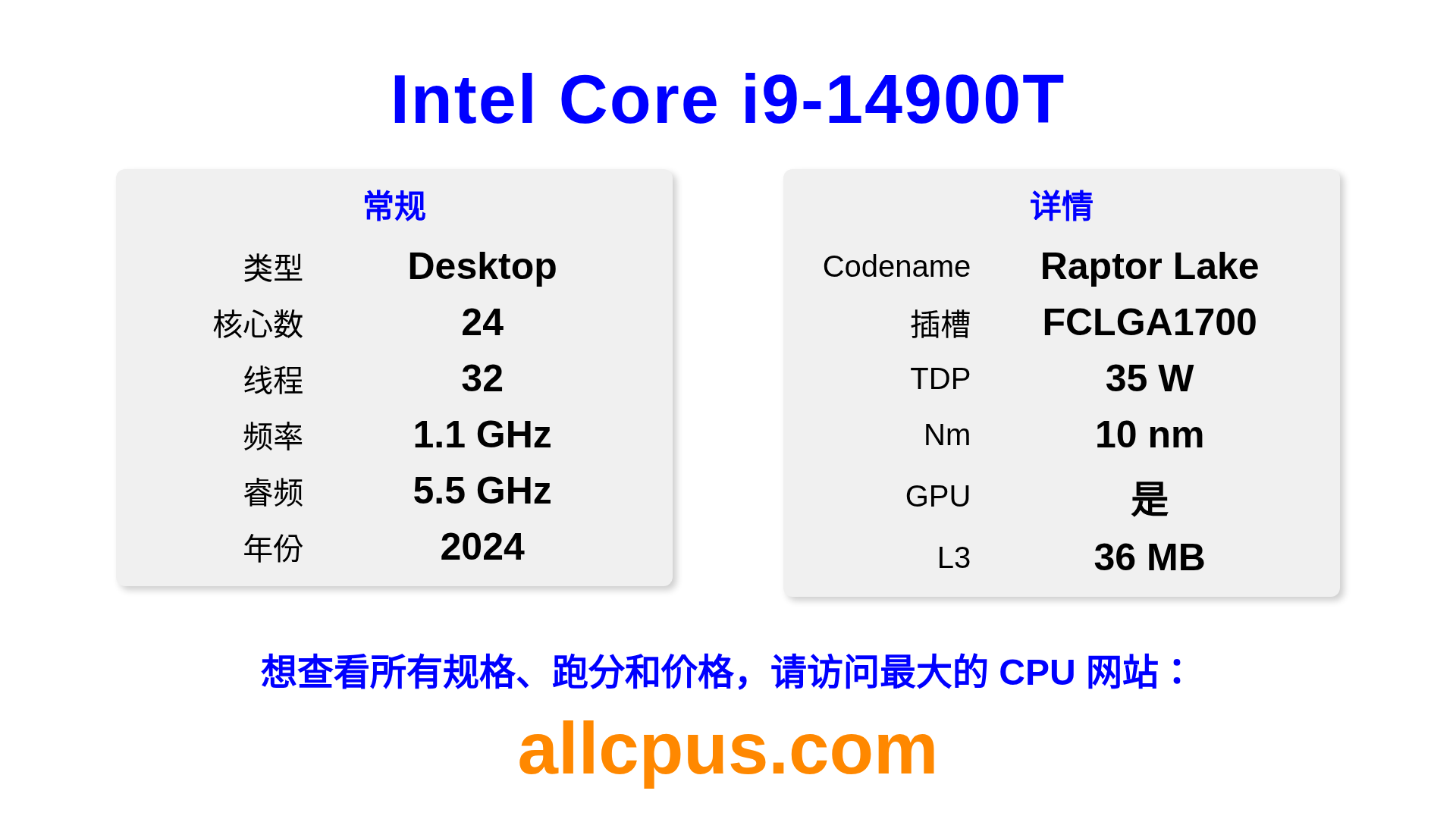 Intel Core i9-14900T 是 Intel Intel Core 系列的 桌面处理器,基于 Raptor Lake 架构,于 2024 发布。 这款 CPU 拥有 24 核心,基础频率为 1100 MHz,最高加速频率为 5500 MHz,L3 缓存为 36 MB。 使用 10 nm 工艺制造。Intel Core i9-14900T 设计用于 LGA1700 插槽。 包括集成的 Intel® UHD Graphics 770 显卡。