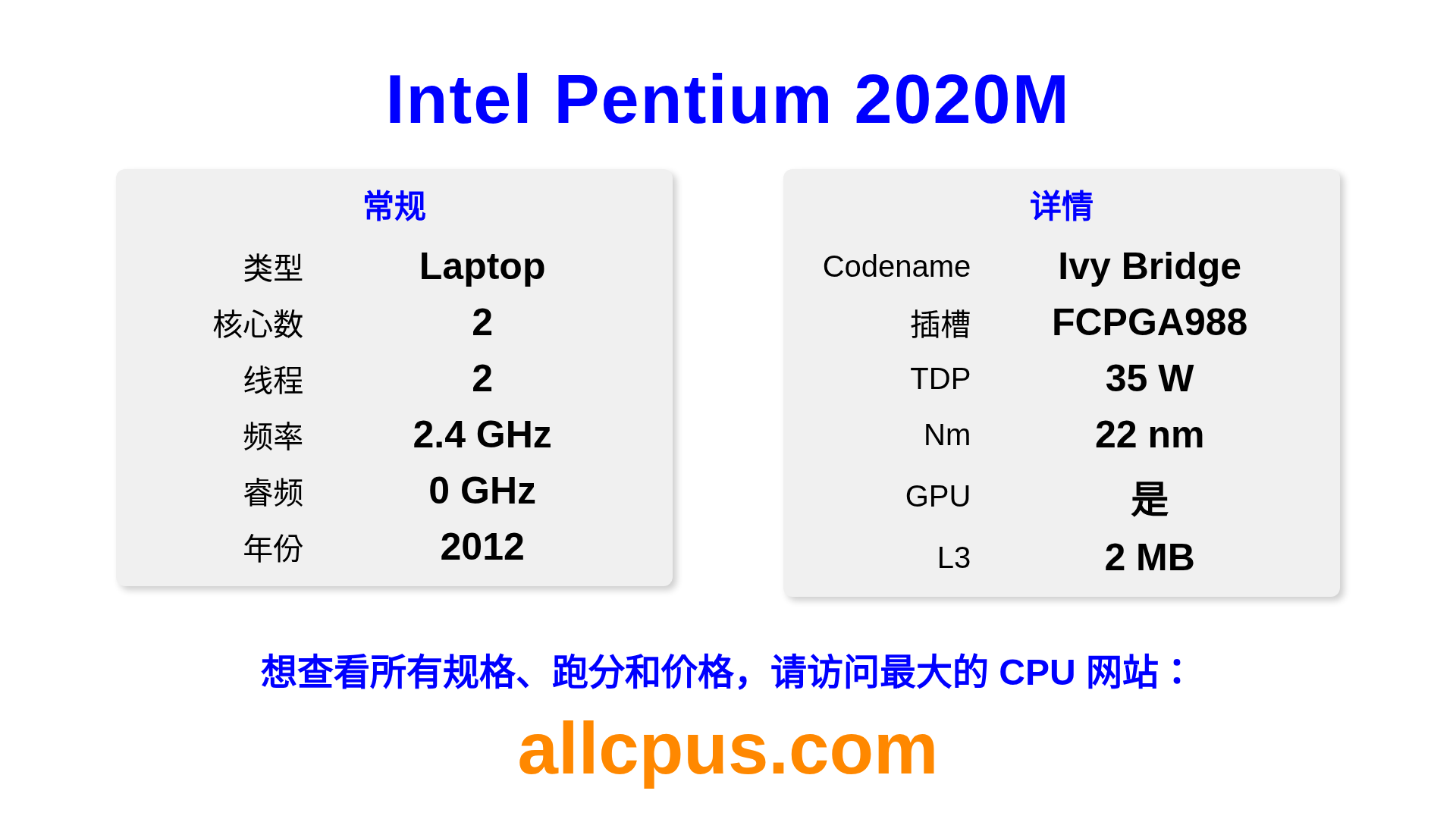 Intel Pentium 2020M 是 Intel Intel® Pentium® 系列的 笔记本处理器,基于 Ivy Bridge 架构,于 2012 发布。 这款 CPU 拥有 2 核心,基础频率为 2400 MHz,最高加速频率为 0 MHz,L3 缓存为 2 MB。 使用 22 nm 工艺制造。Intel Pentium 2020M 设计用于 PGA988 插槽。 包括集成的 Intel® HD Graphics for 3rd Generation Intel® Processors 显卡。