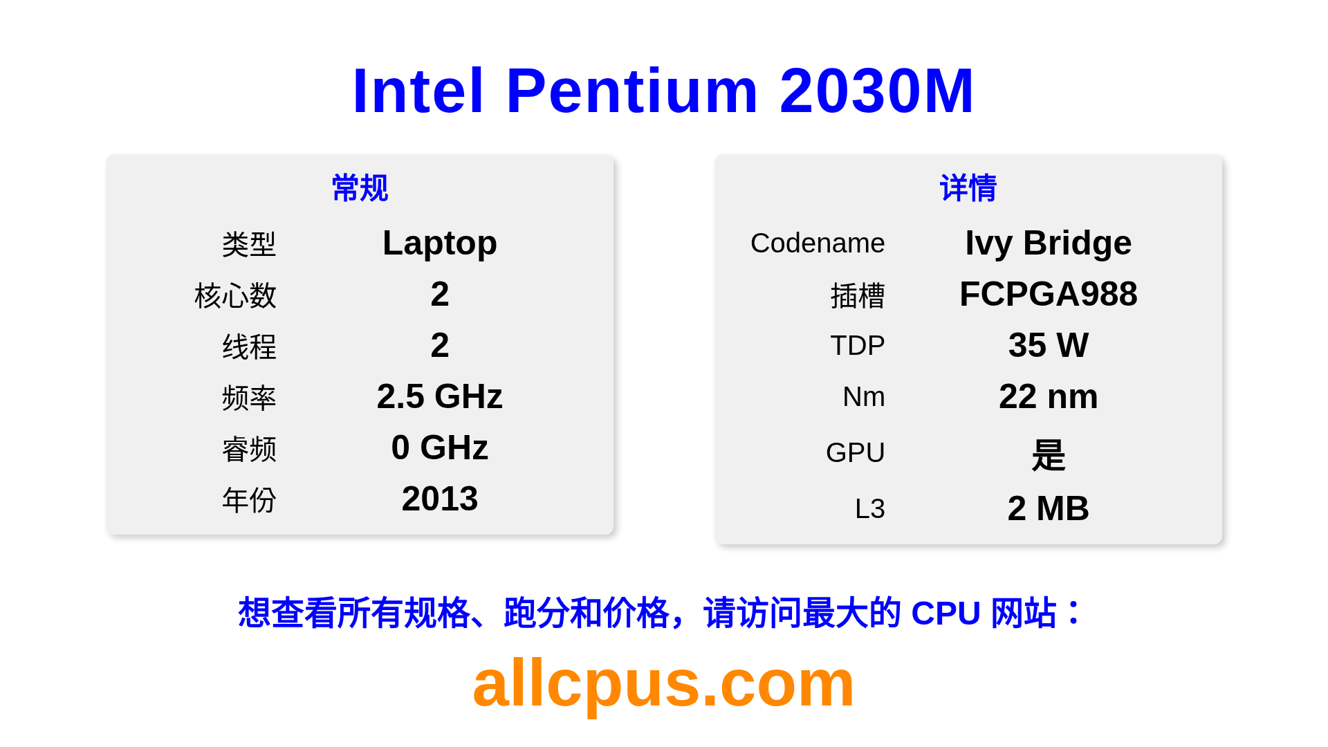 Intel Pentium 2030M 是 Intel Intel® Pentium® 系列的 笔记本处理器,基于 Ivy Bridge 架构,于 2013 发布。 这款 CPU 拥有 2 核心,基础频率为 2500 MHz,最高加速频率为 0 MHz,L3 缓存为 2 MB。 使用 22 nm 工艺制造。Intel Pentium 2030M 设计用于 PGA988 插槽。 包括集成的 Intel® HD Graphics for 3rd Generation Intel® Processors 显卡。