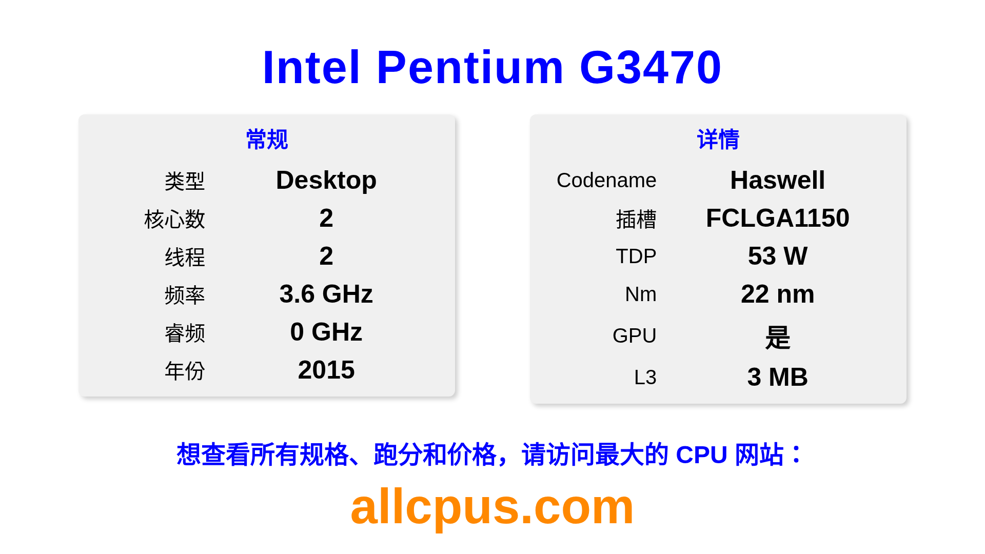Intel Pentium G3470 是 Intel Intel® Pentium® 系列的 桌面处理器,基于 Haswell 架构,于 2015 发布。 这款 CPU 拥有 2 核心,基础频率为 3600 MHz,最高加速频率为 0 MHz,L3 缓存为 3 MB。 使用 22 nm 工艺制造。Intel Pentium G3470 设计用于 LGA1150 插槽。 包括集成的 Intel® HD Graphics for 4th Generation Intel® Processors 显卡。