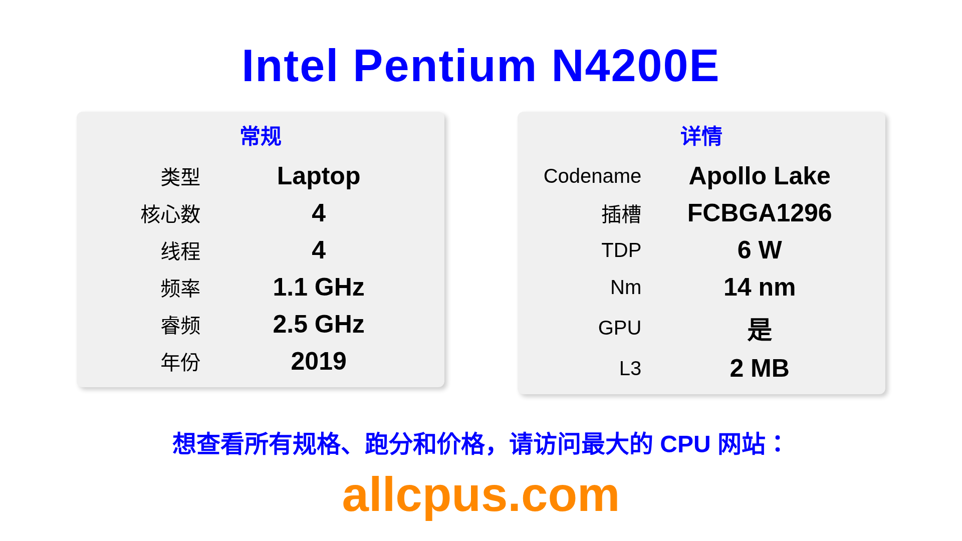 Intel Pentium N4200E 是 Intel Intel® Pentium® 系列的 笔记本处理器,基于 Apollo Lake 架构,于 2019 发布。 这款 CPU 拥有 4 核心,基础频率为 1100 MHz,最高加速频率为 2500 MHz,L3 缓存为 2 MB。 使用 14 nm 工艺制造。Intel Pentium N4200E 设计用于 BGA1296 插槽。 包括集成的 Intel® HD Graphics 505 显卡。