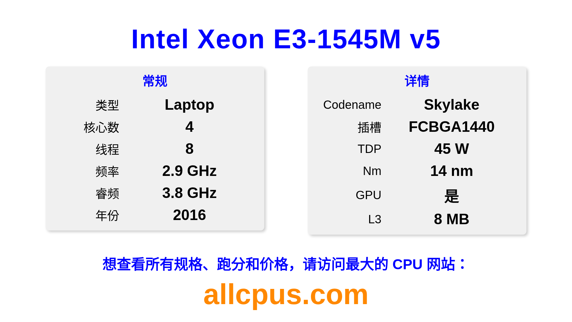 Intel Xeon E3-1545M v5 是 Intel Intel Xeon 系列的 笔记本处理器,基于 Skylake 架构,于 2016 发布。 这款 CPU 拥有 4 核心,基础频率为 2900 MHz,最高加速频率为 3800 MHz,L3 缓存为 8 MB。 使用 14 nm 工艺制造。Intel Xeon E3-1545M v5 设计用于 BGA1440 插槽。 包括集成的 Intel® Iris® Pro Graphics P580 显卡。
