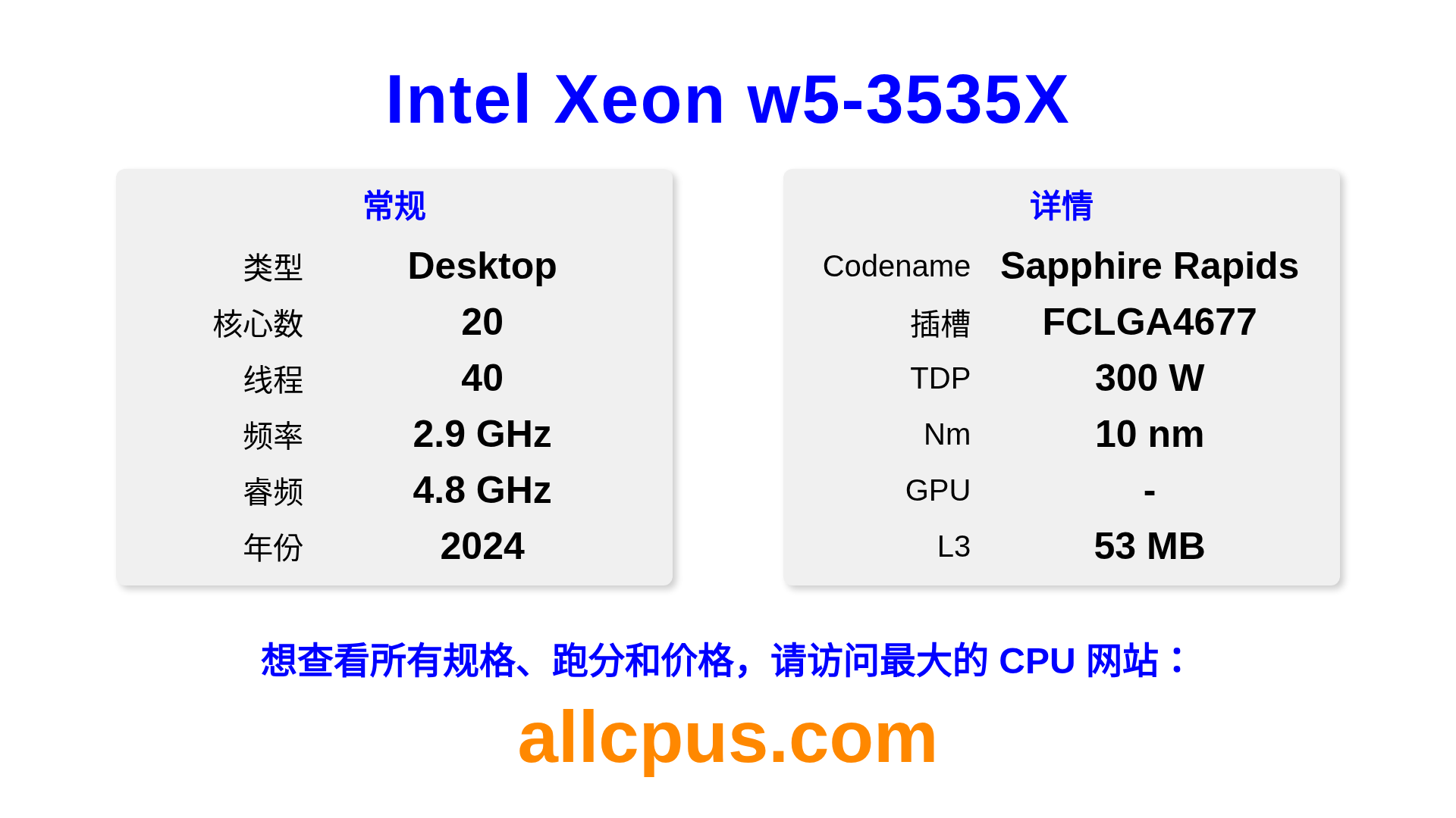 Intel Xeon w5-3535X 是 Intel Intel Xeon 系列的 桌面处理器,基于 Sapphire Rapids 架构,于 2024 发布。 这款 CPU 拥有 20 核心,基础频率为 2900 MHz,最高加速频率为 4800 MHz,L3 缓存为 53 MB。 使用 10 nm 工艺制造。Intel Xeon w5-3535X 设计用于 LGA4677 插槽。支持超频。 需要独立显卡。