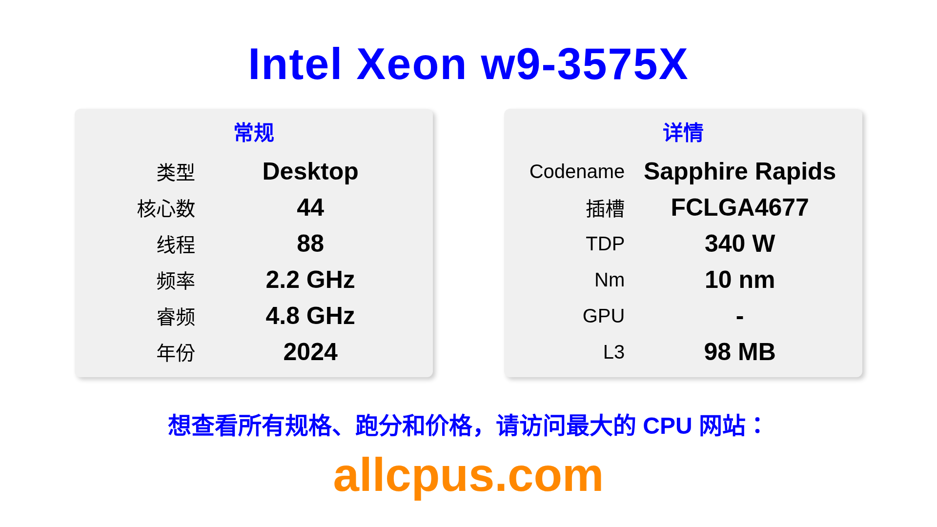 Intel Xeon w9-3575X 是 Intel Intel Xeon 系列的 桌面处理器,基于 Sapphire Rapids 架构,于 2024 发布。 这款 CPU 拥有 44 核心,基础频率为 2200 MHz,最高加速频率为 4800 MHz,L3 缓存为 98 MB。 使用 10 nm 工艺制造。Intel Xeon w9-3575X 设计用于 LGA4677 插槽。支持超频。 需要独立显卡。